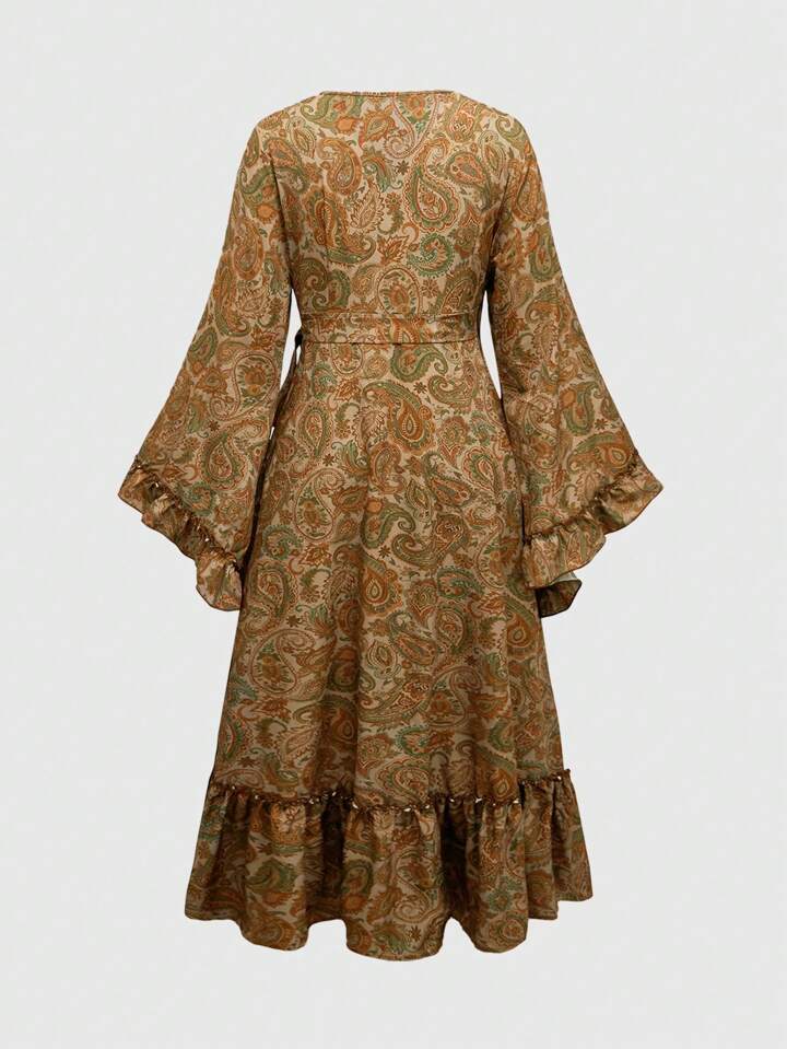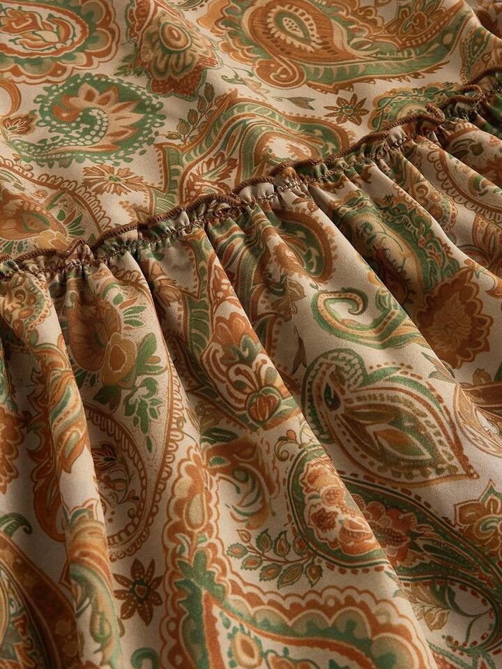 Abito corto da donna con stampa paisley hippie su tutta la superficie, spalle scoperte, maniche a balze, orlo asimmetrico, cintura in vita