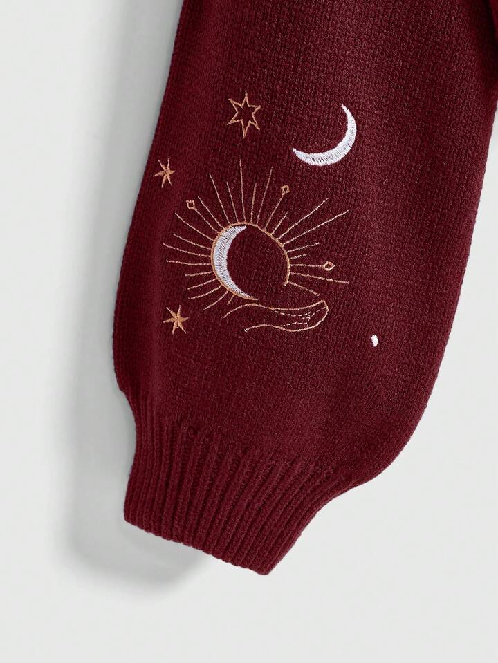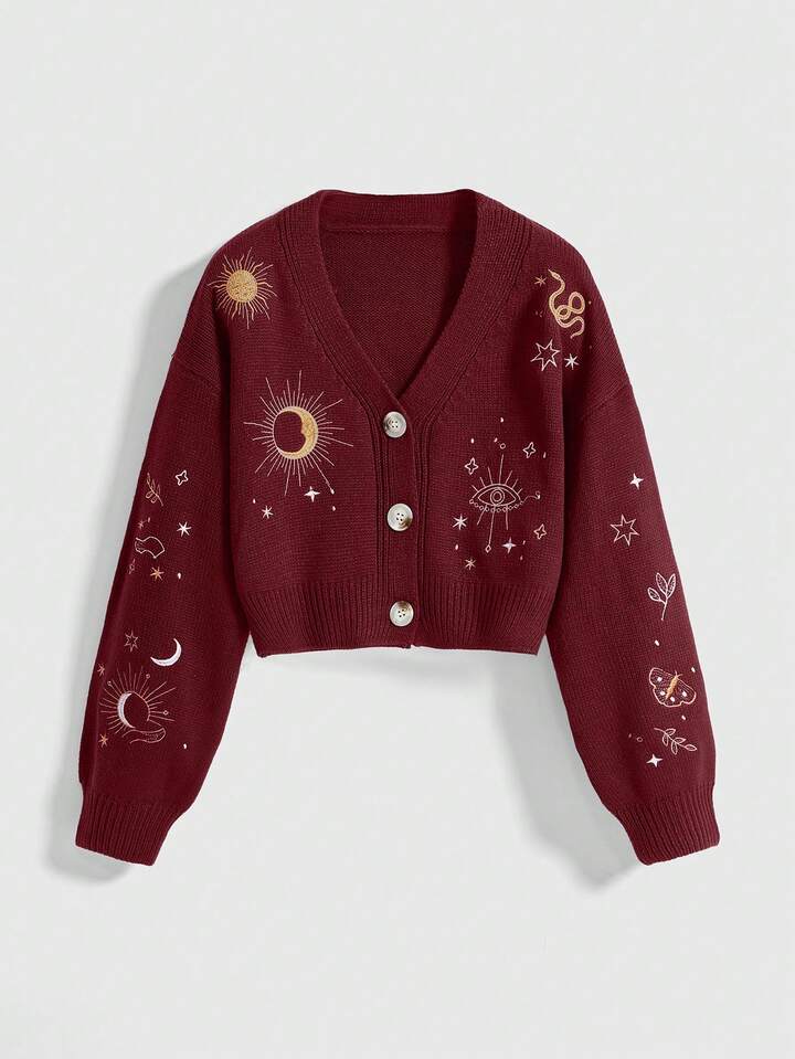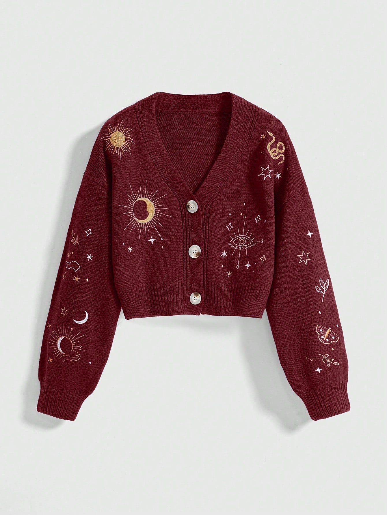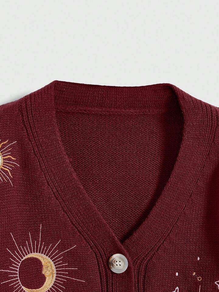Cardigan da donna in stile hippie con ricami di sole, luna, stelle e serpente