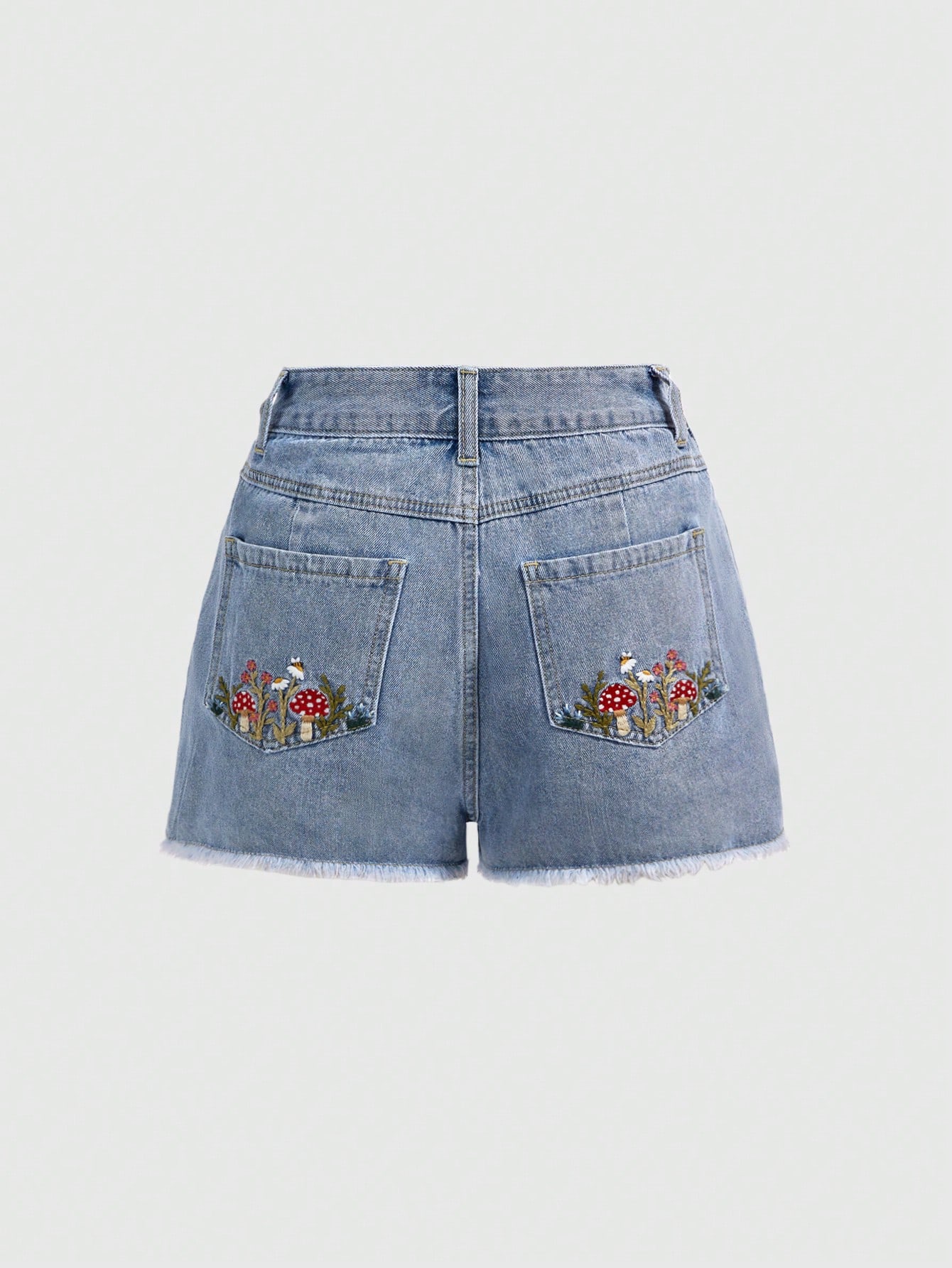 Pantaloncini di jeans scoloriti e strappati da donna, stile vintage con orlo sfilacciato, pantaloncini estivi casual alla moda con tasche con ricamo floreale 3D