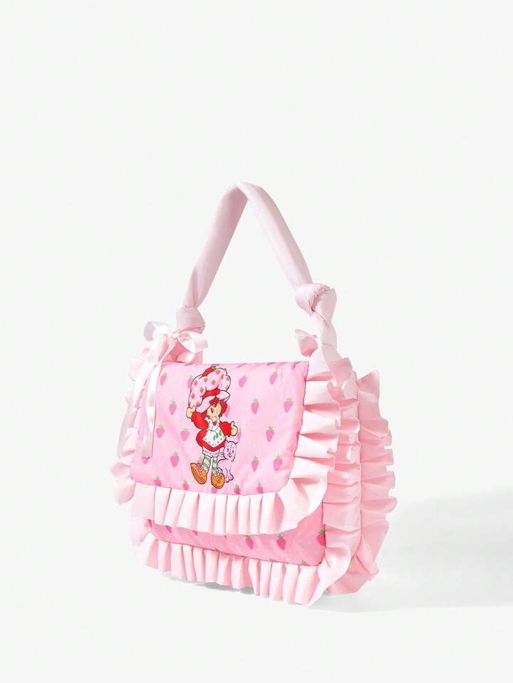 Borsa a spalla da donna con volant rosa, decorata con motivi carini a cartoni animati e fragole