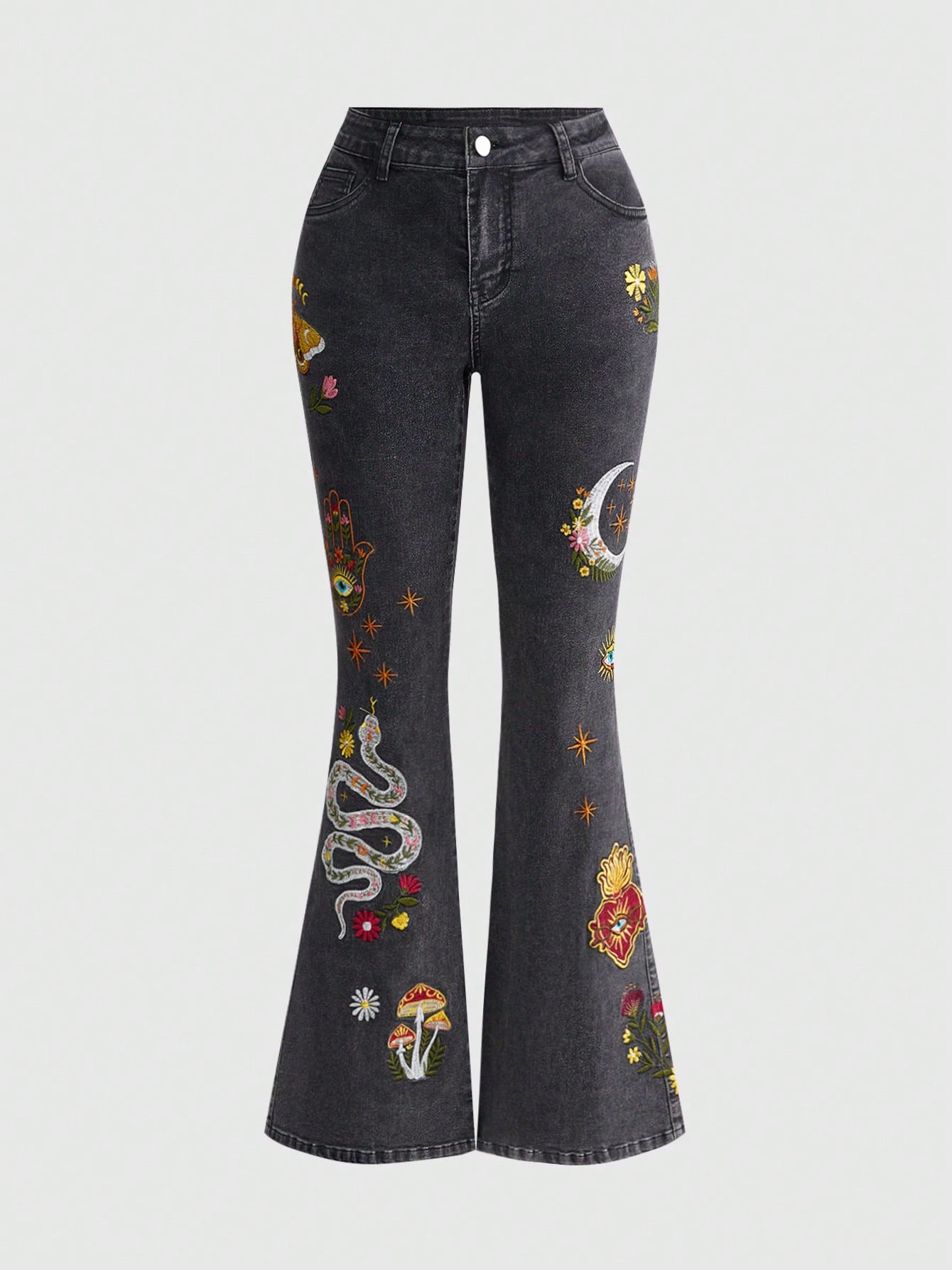 Goth Jeans a vita bassa a zampa d'elefante con ricamo retrò gotico di serpente, falena e occhio a cuore per donne