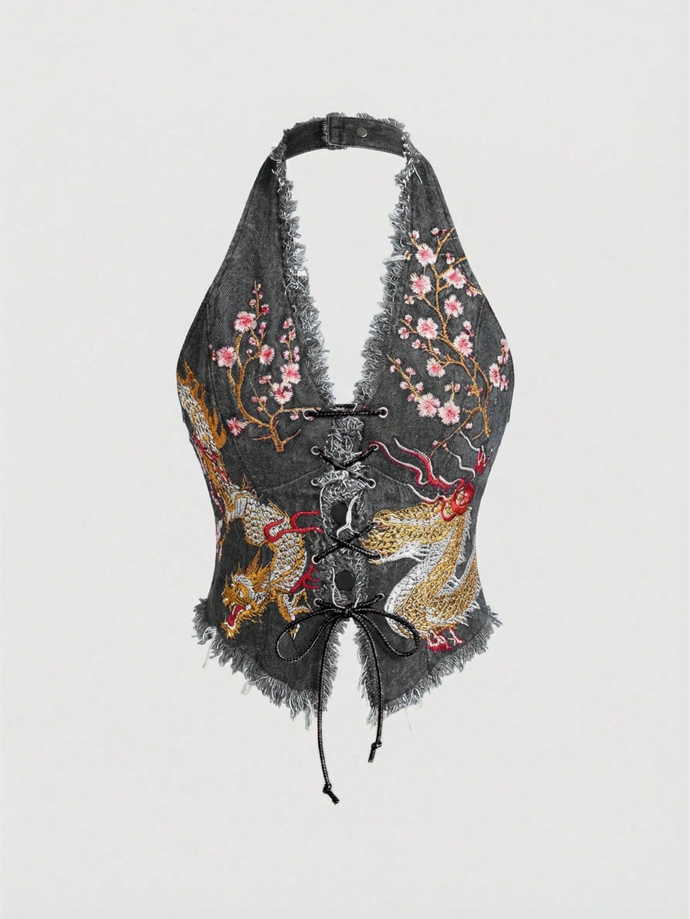 J-Fashion Camicia di jeans retrò da motociclista, stile cinese moderno, con ricamo, scollo alla halter, sexy