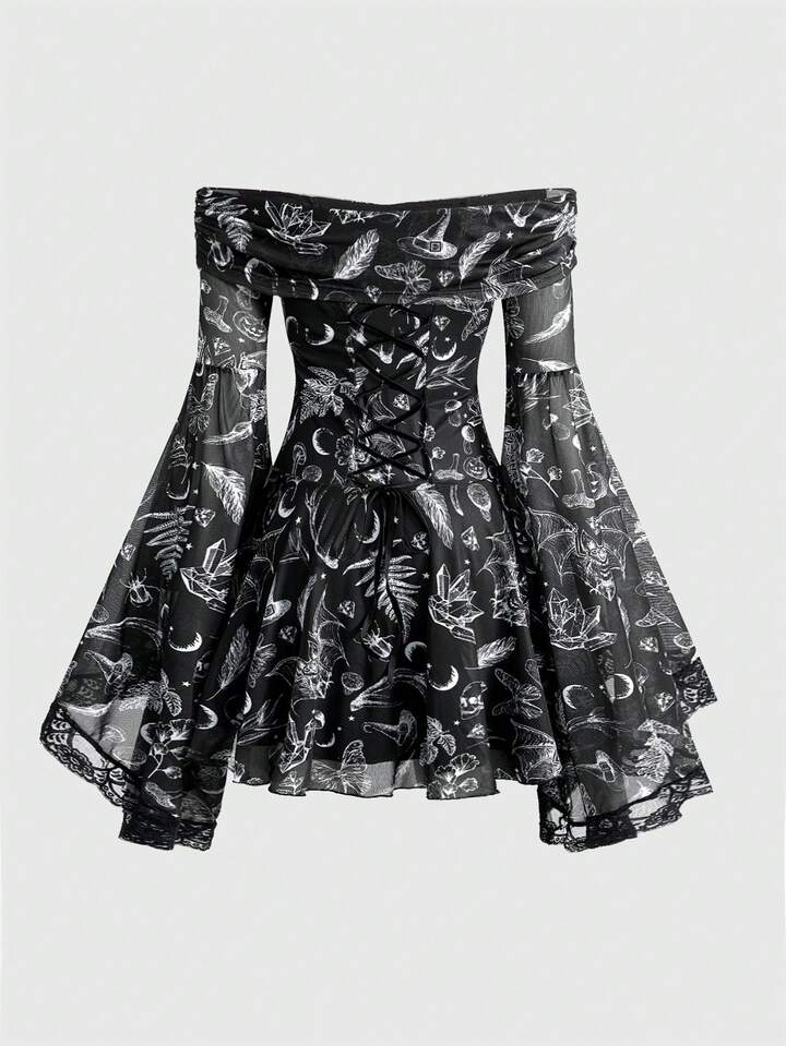 Goth Abito corto da donna in stile retrò romantico gotico con stampa di teschi, pipistrelli e piante, scollo spalle scoperte, maniche a sbuffo, orlo asimmetrico e dettagli in pizzo