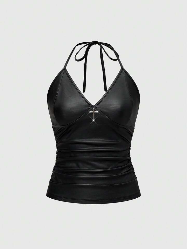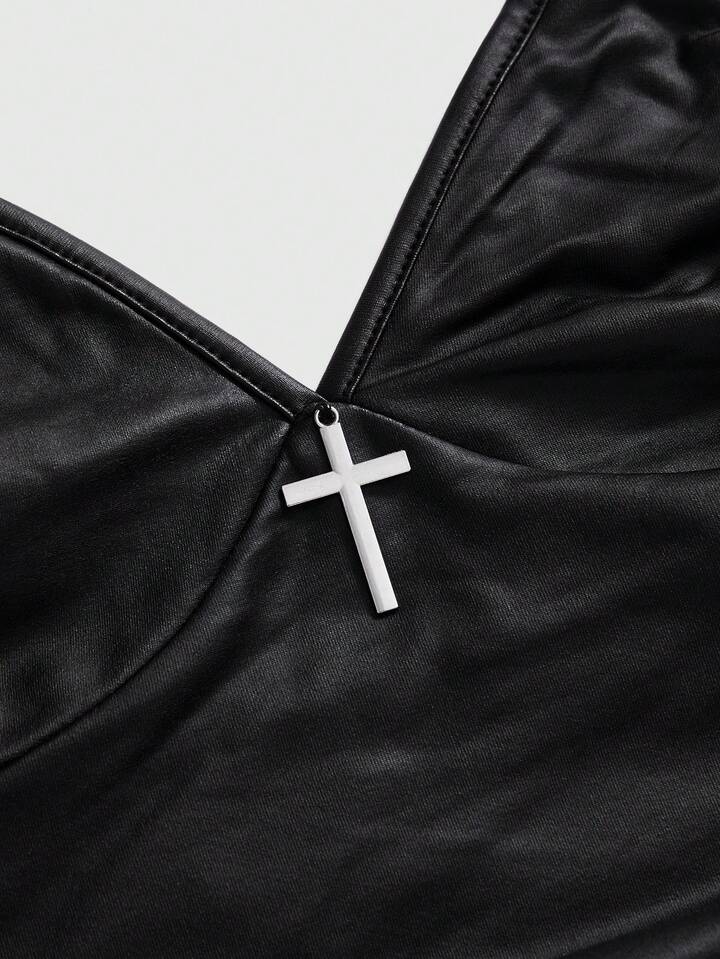 Goth Canotta donna sexy in PU con incrocio gotico pendente, arricciata ai lati