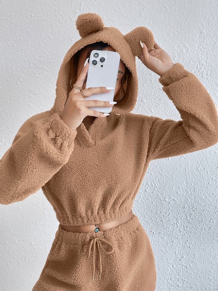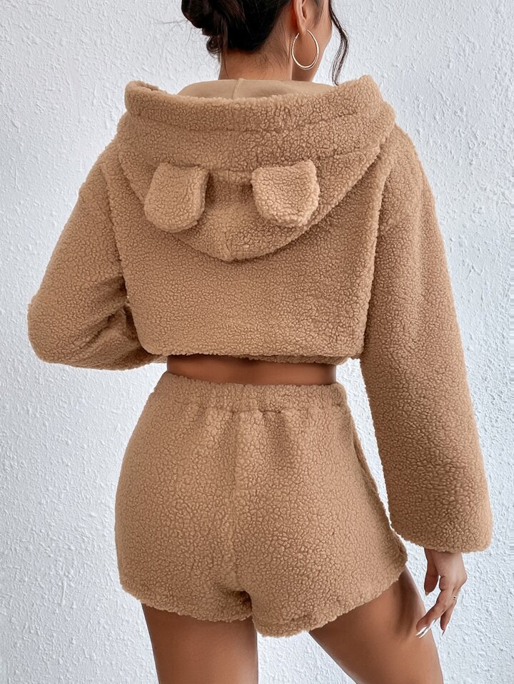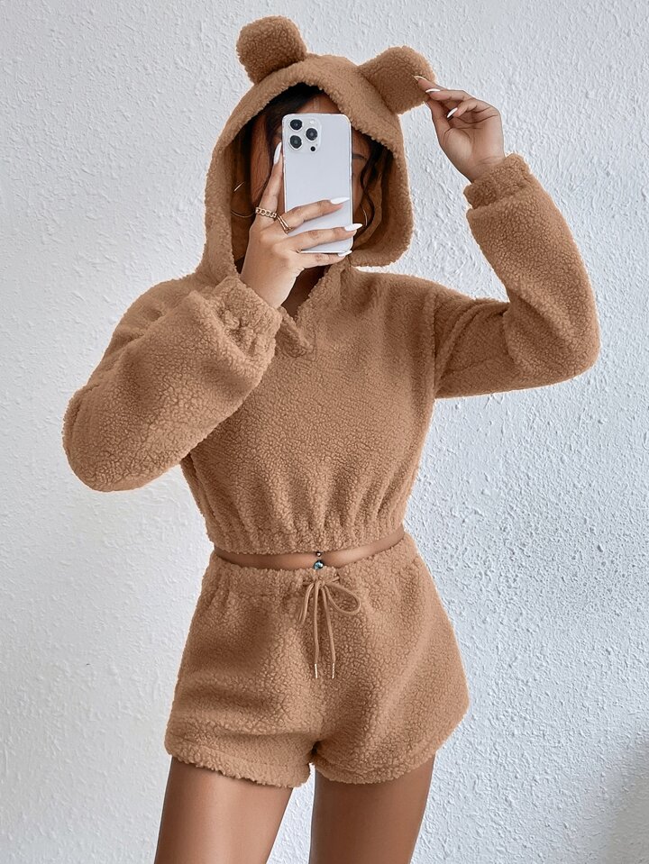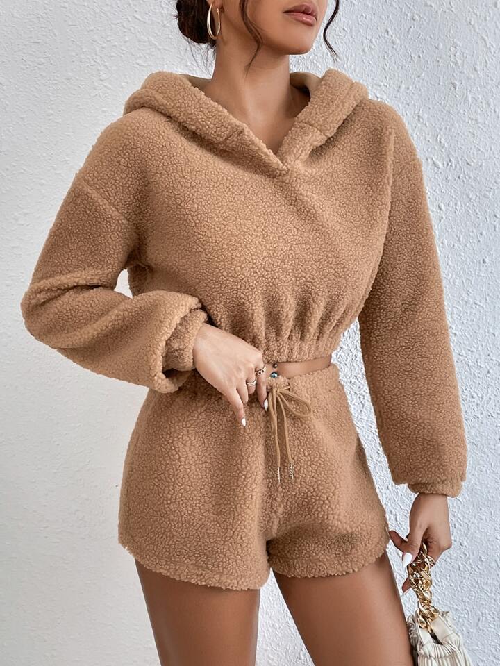 Set casual da donna composto da felpa con cappuccio e pantaloncini in tinta unita, 2 pezzi