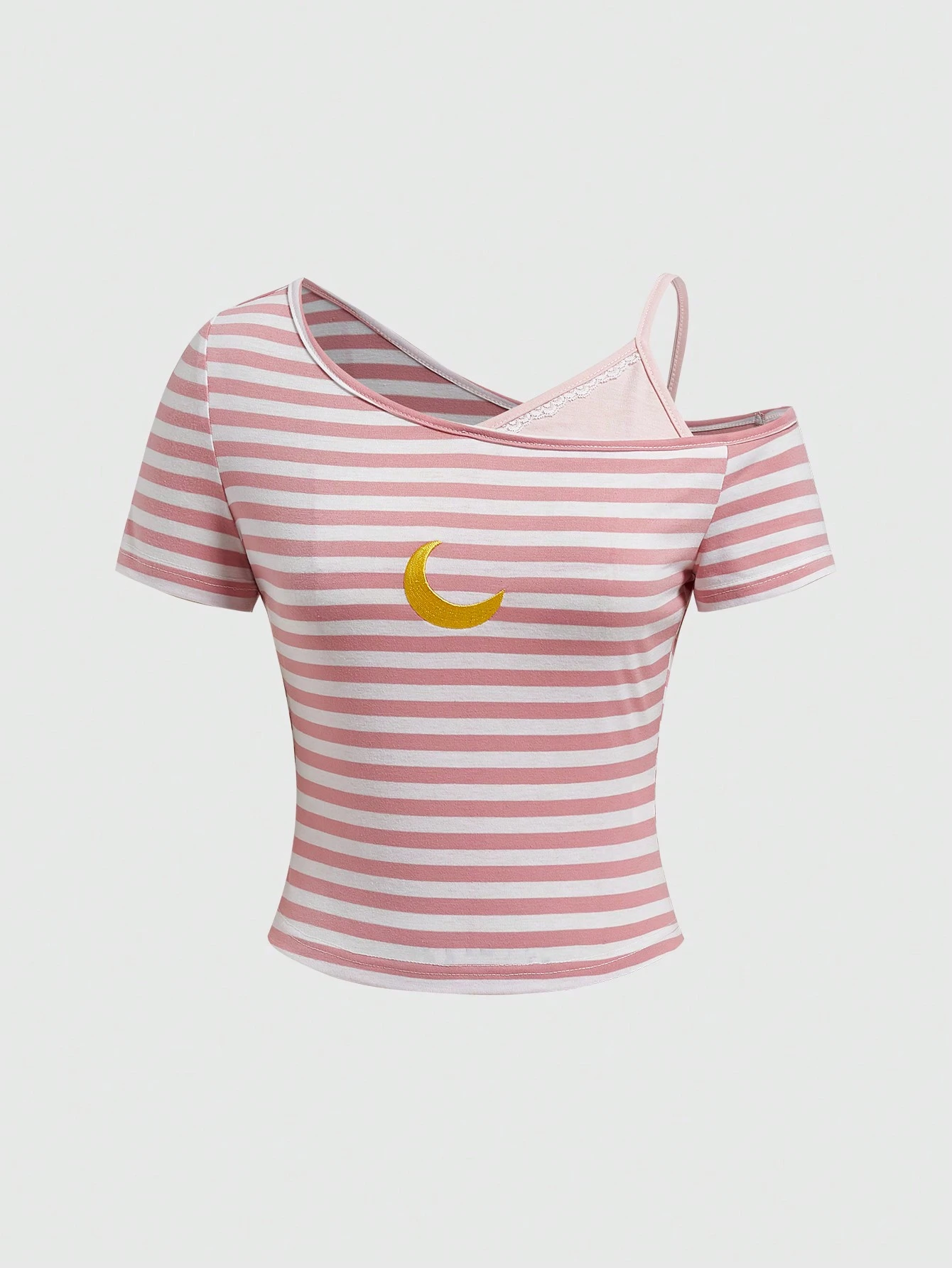 Camicetta Donna A Righe Con Manica Corta A Collo Asimmetrico E Ricamo Di Luna