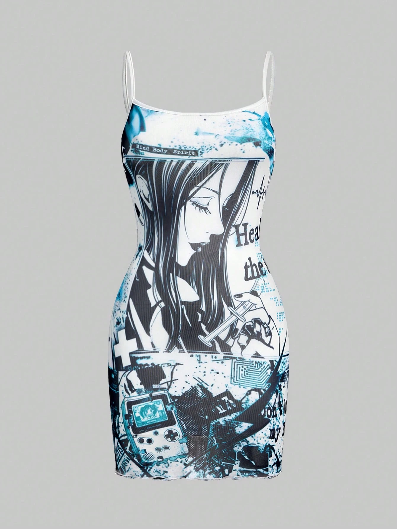 Anime Abito mini da donna con stampa di siringhe mediche e pillole in stile Y2K