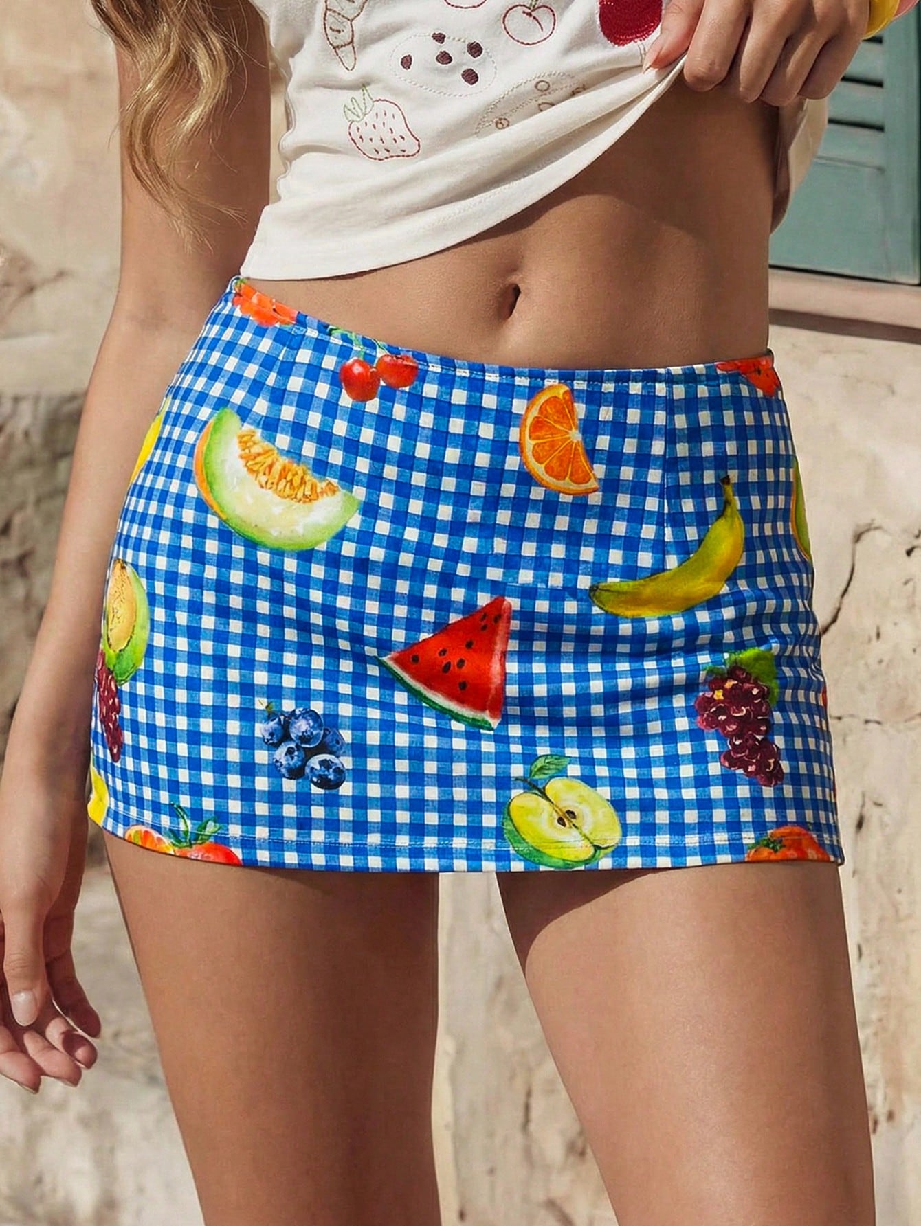 Gonna mini aderente a vita ultra bassa con stampa a quadri e frutti, in stile Y2K