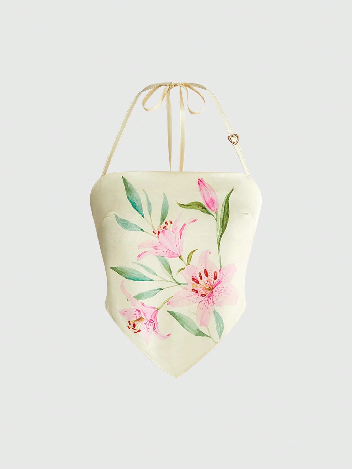 Canotta sexy da donna con stampa di giglio, collo alto e lacci, stile Y2K