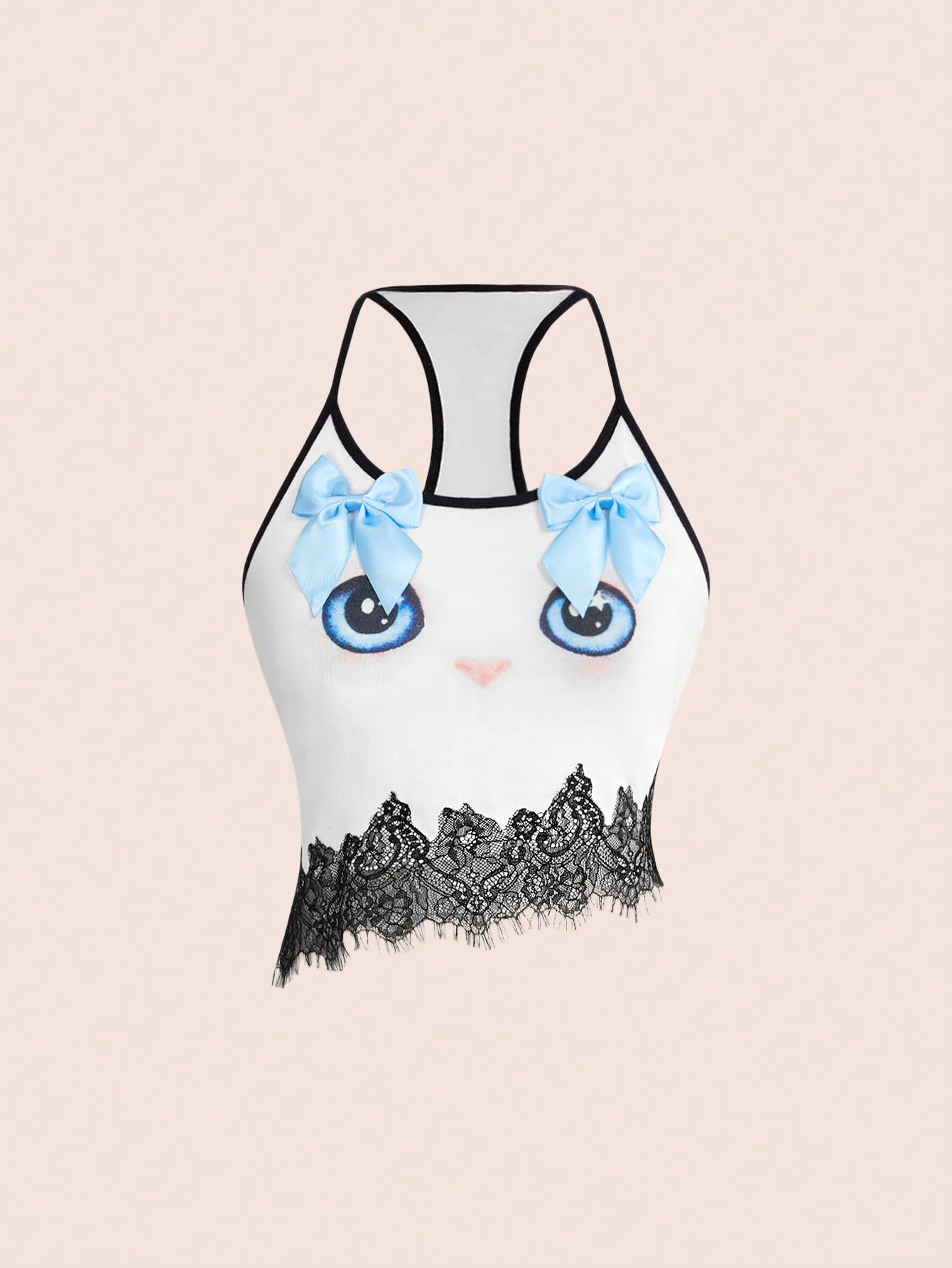 Canotta da donna con grafica di gatto timido con fiocco, in stile estetico giapponese Y2K