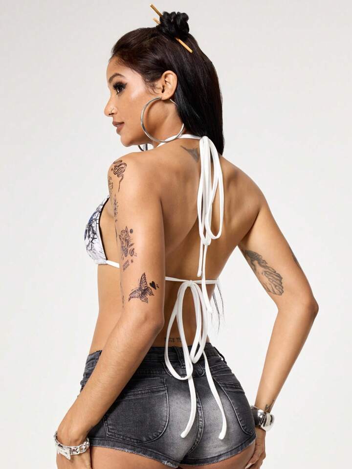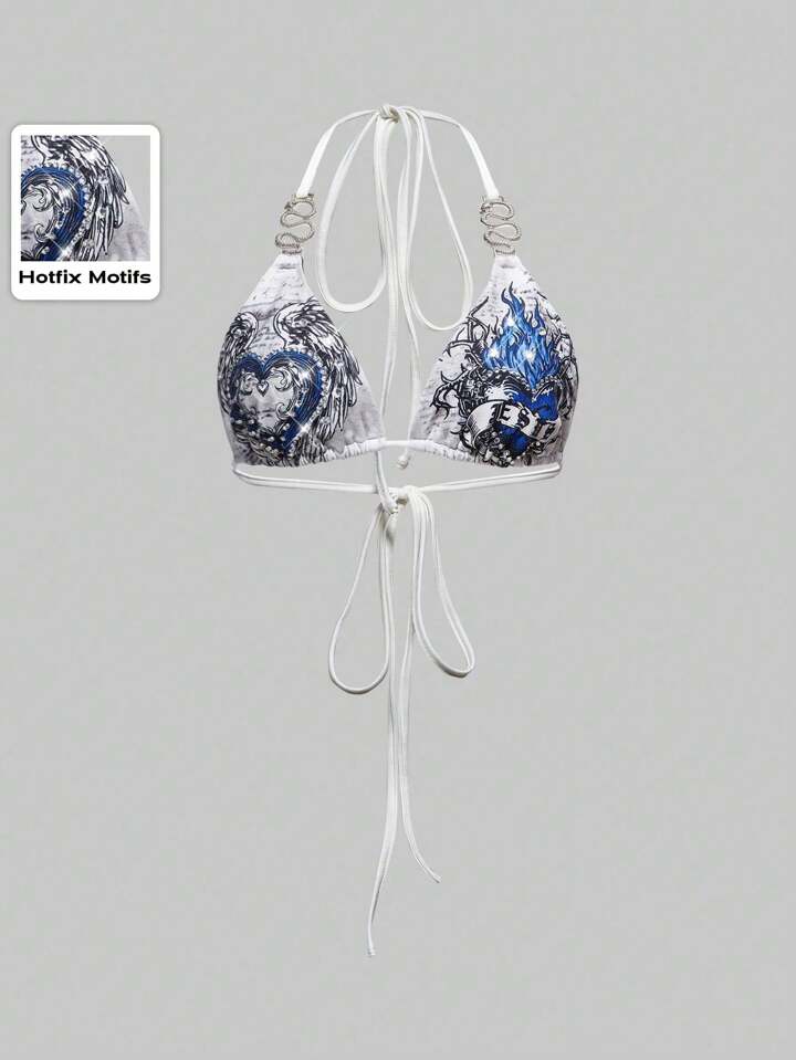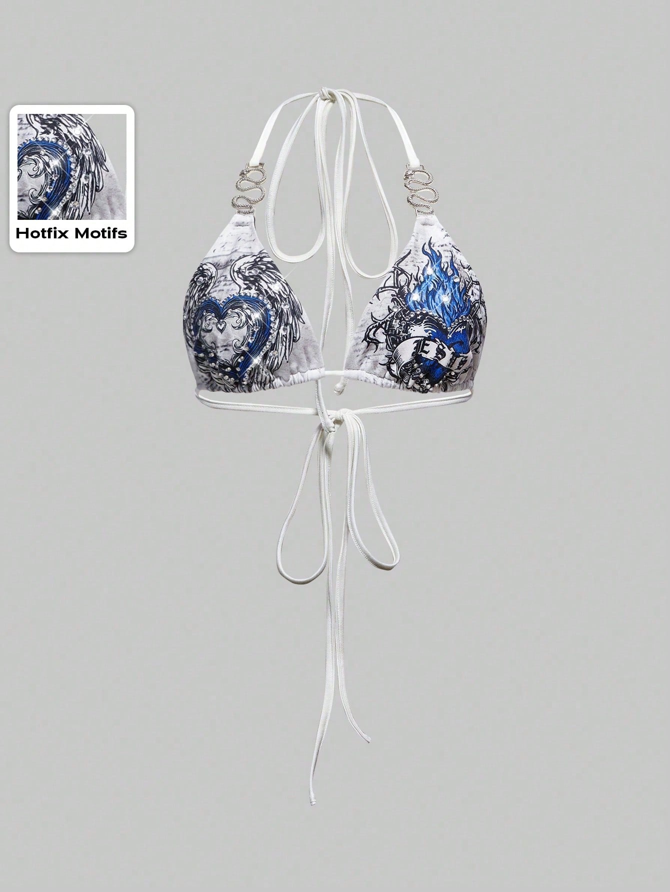 Canotta da bikini con stampa a cuore e ali strass in stile punk Y2K