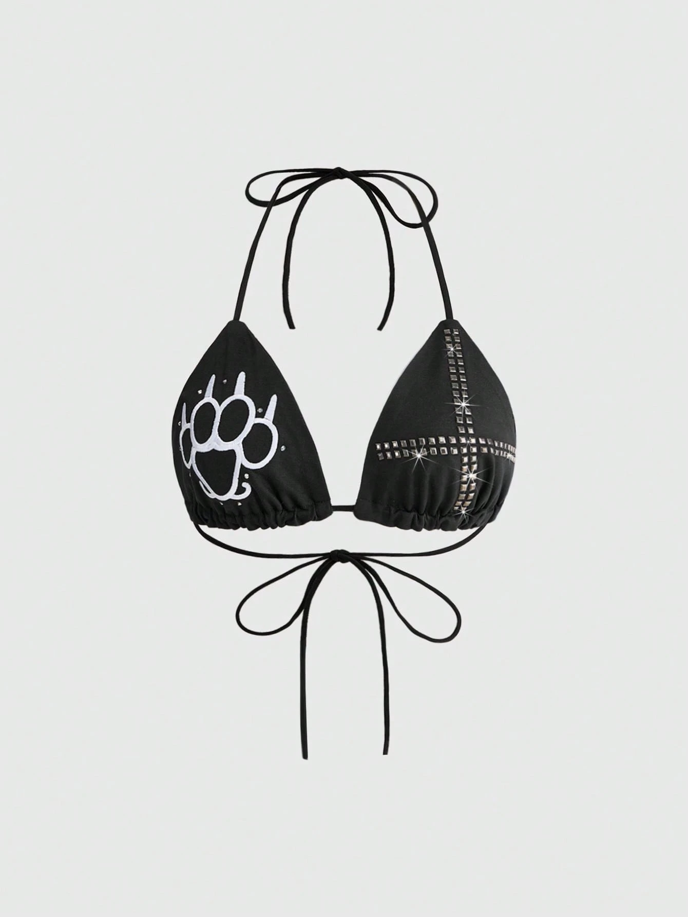 Bikini top sexy Y2K con ricamo a croce, borchie e strass
