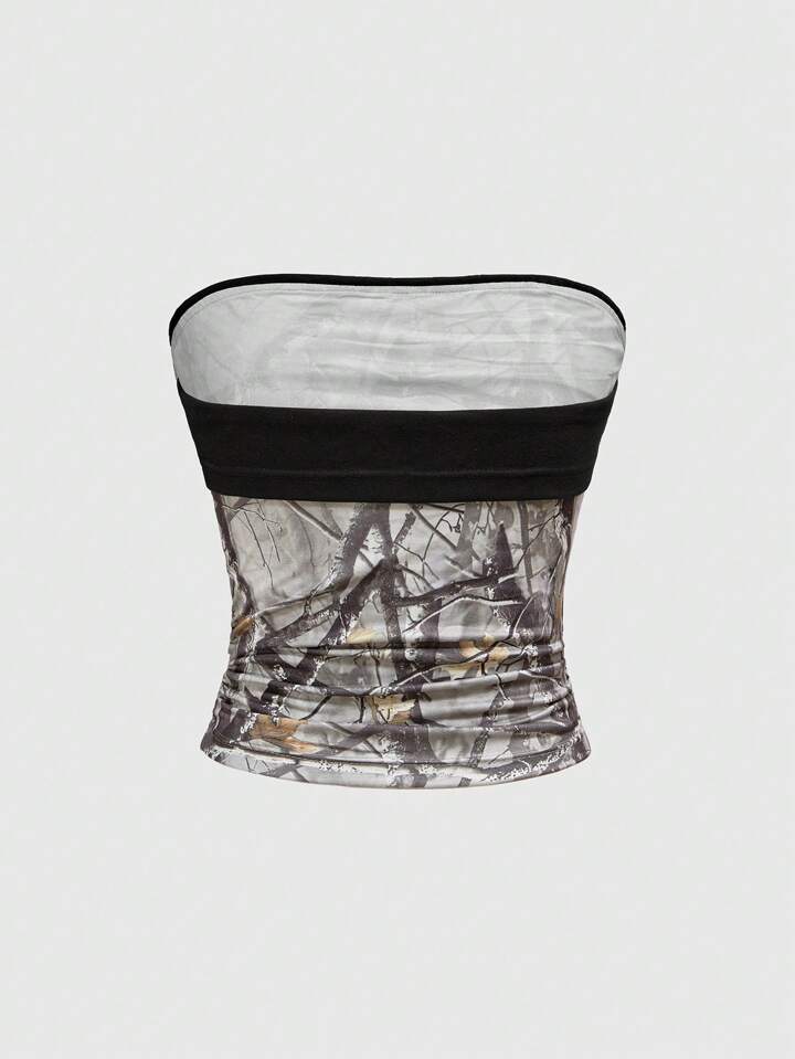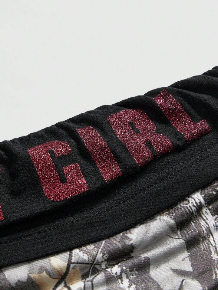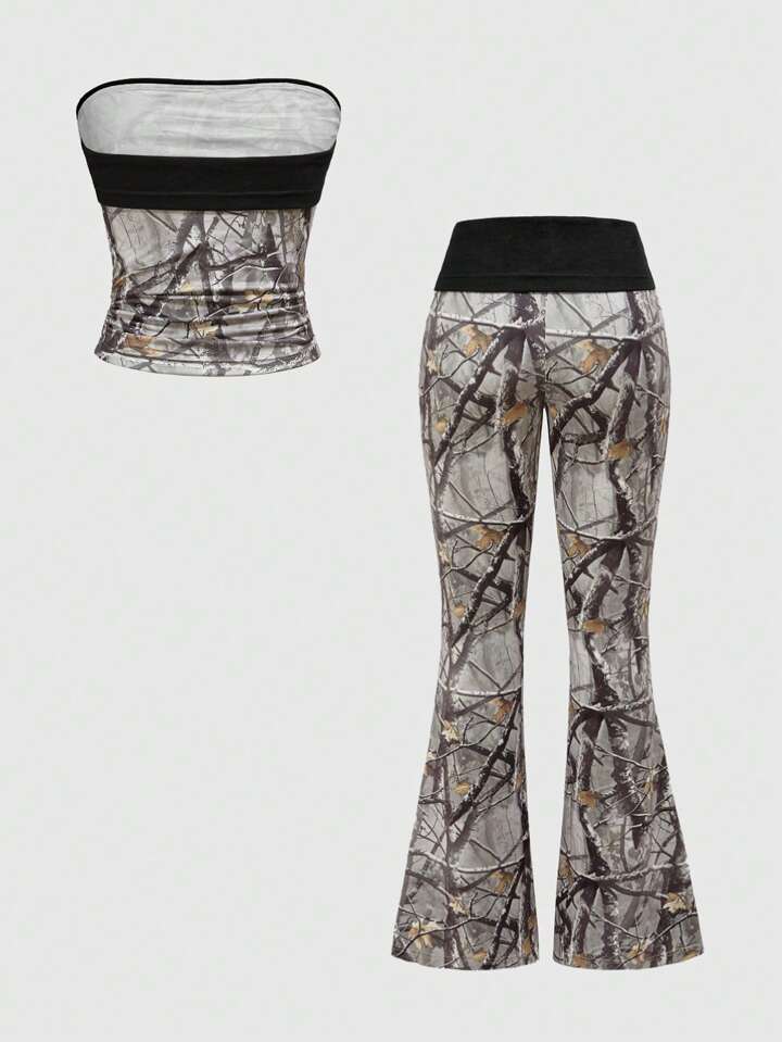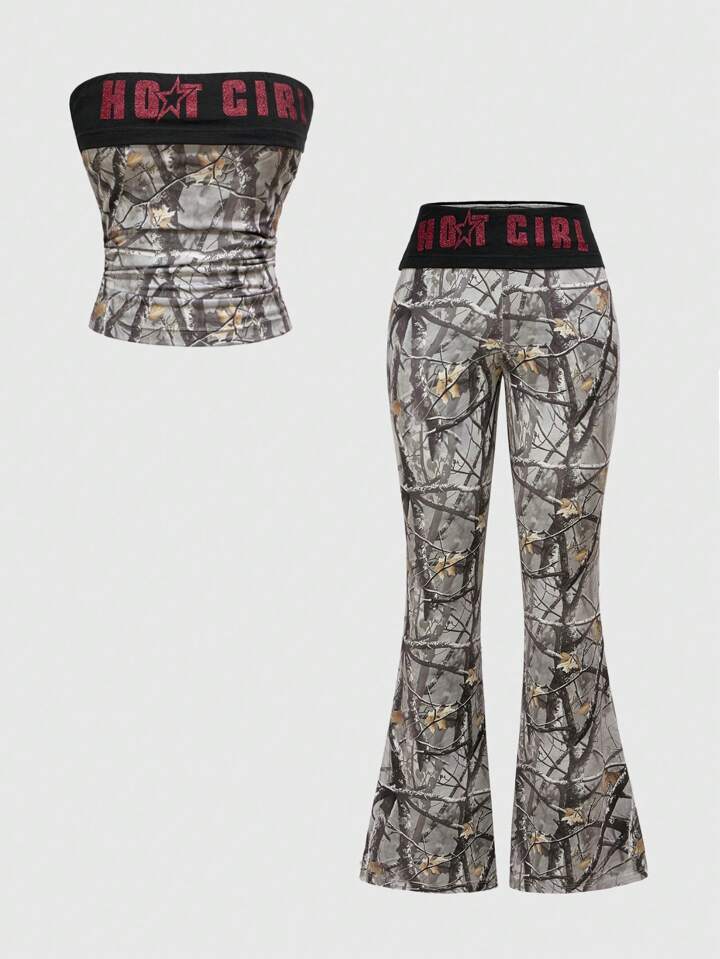 Set di 2 pezzi da donna composto da pantaloni a zampa a vita bassa in stile mimetico e canotta corta, in stile Y2K