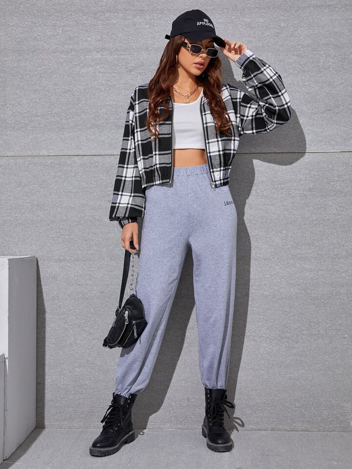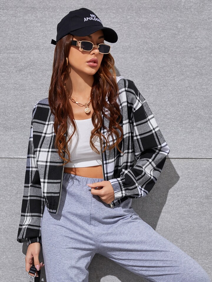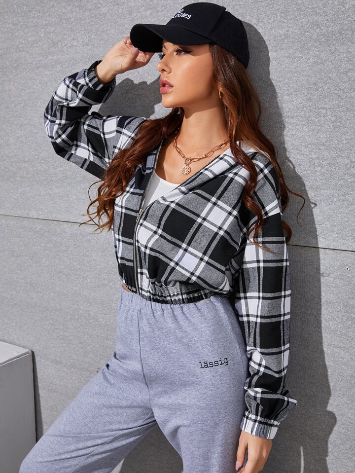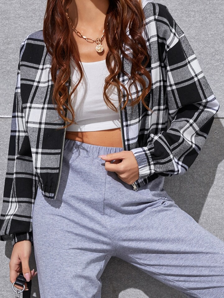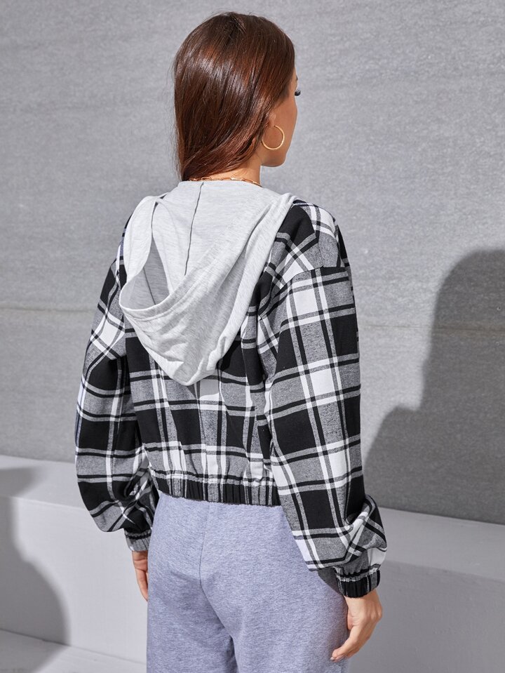 Giacca a quadri con cappuccio a contrasto e cerniera