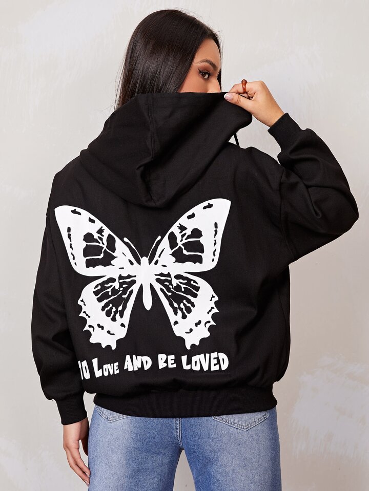 Cazadora con mariposa & con estampado de slogan de hombros caídos con cordón con capucha