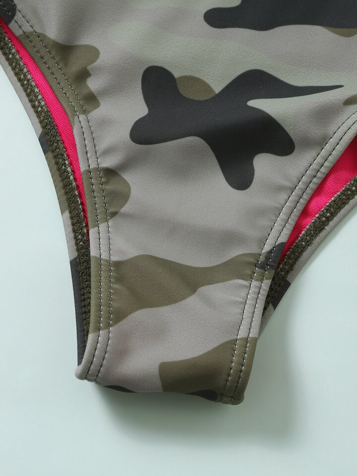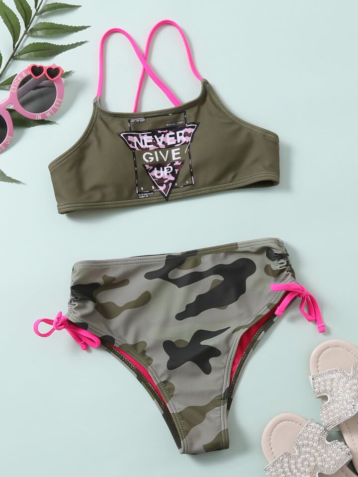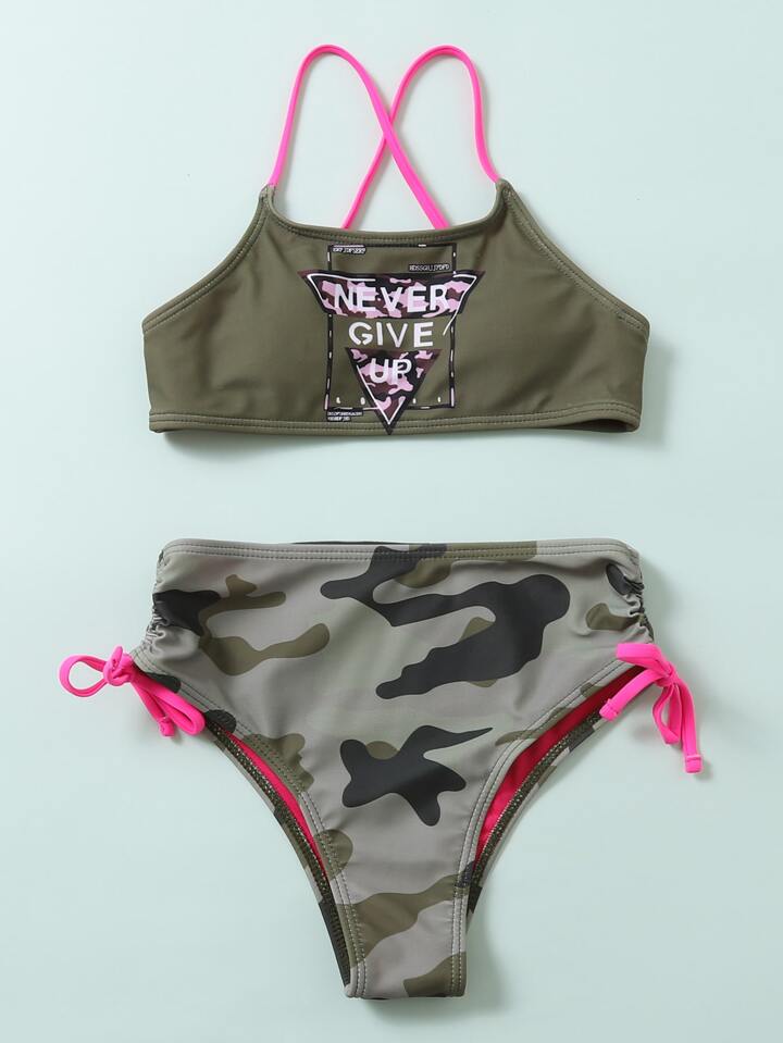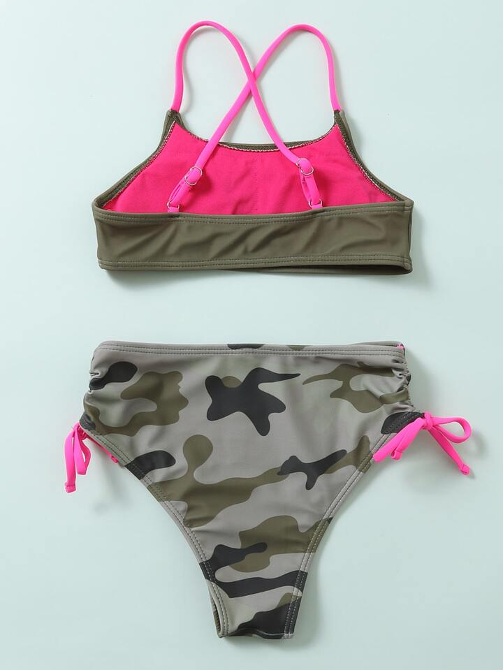Tween Girl Camo Print Drawstring Side Bikini Set Summer Beach