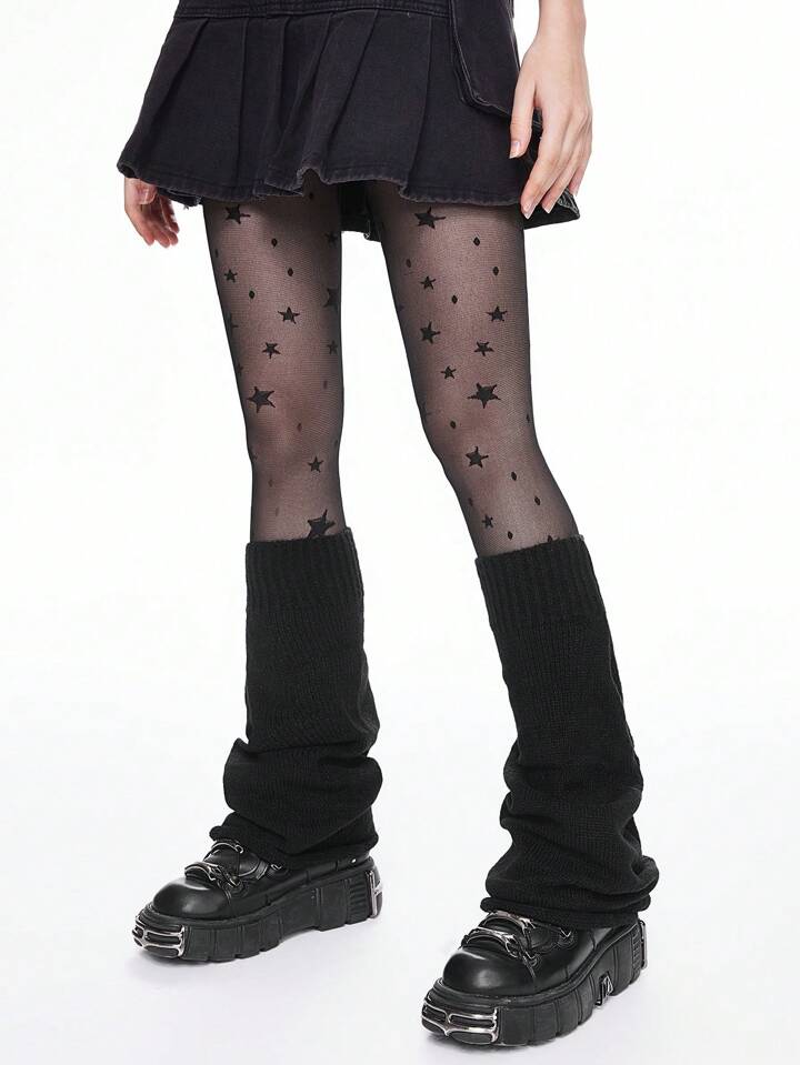 1 Pair Black Warm Leg Warmers With 1 Pc Five-Pointed Star Tights Combo, Gothic Punk Sexy Legwear Set For Women