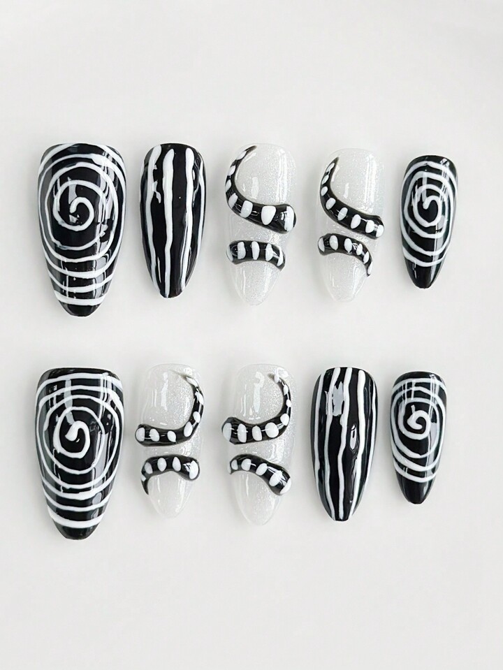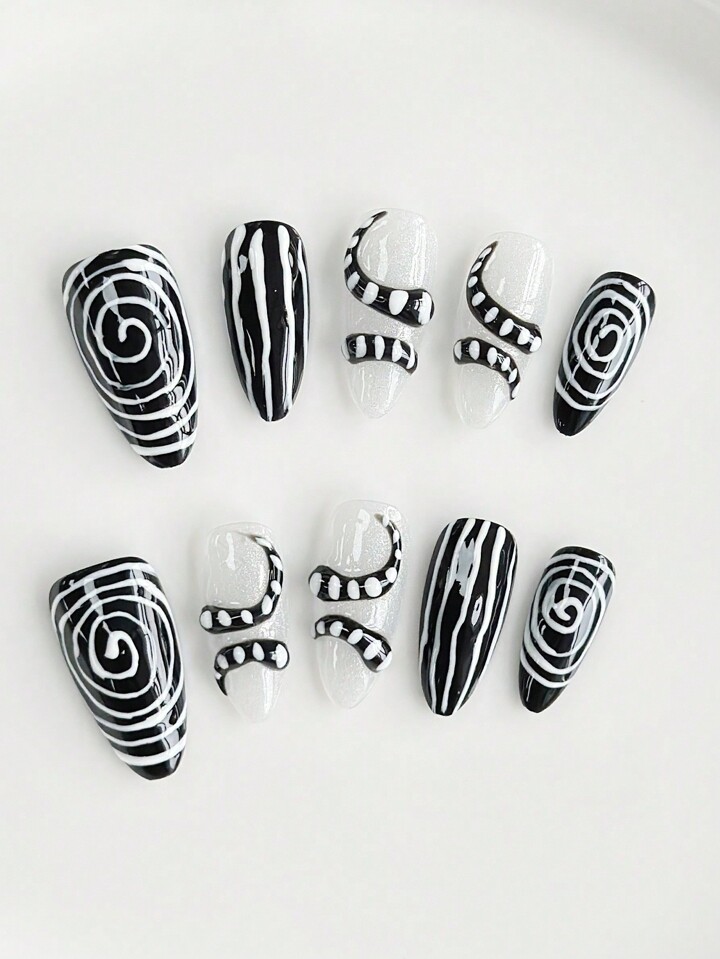 10pcs High-Quality Handmade Fake Nails With Dark Style 3D Snake Design + 3pcs Double-Sided Adhesive, Y2K Gothic Style Nail Art, Removable Hand-Drawn Nail Stickers, Suitable For Festivals, Parties, Dance Performances And Daily Wear