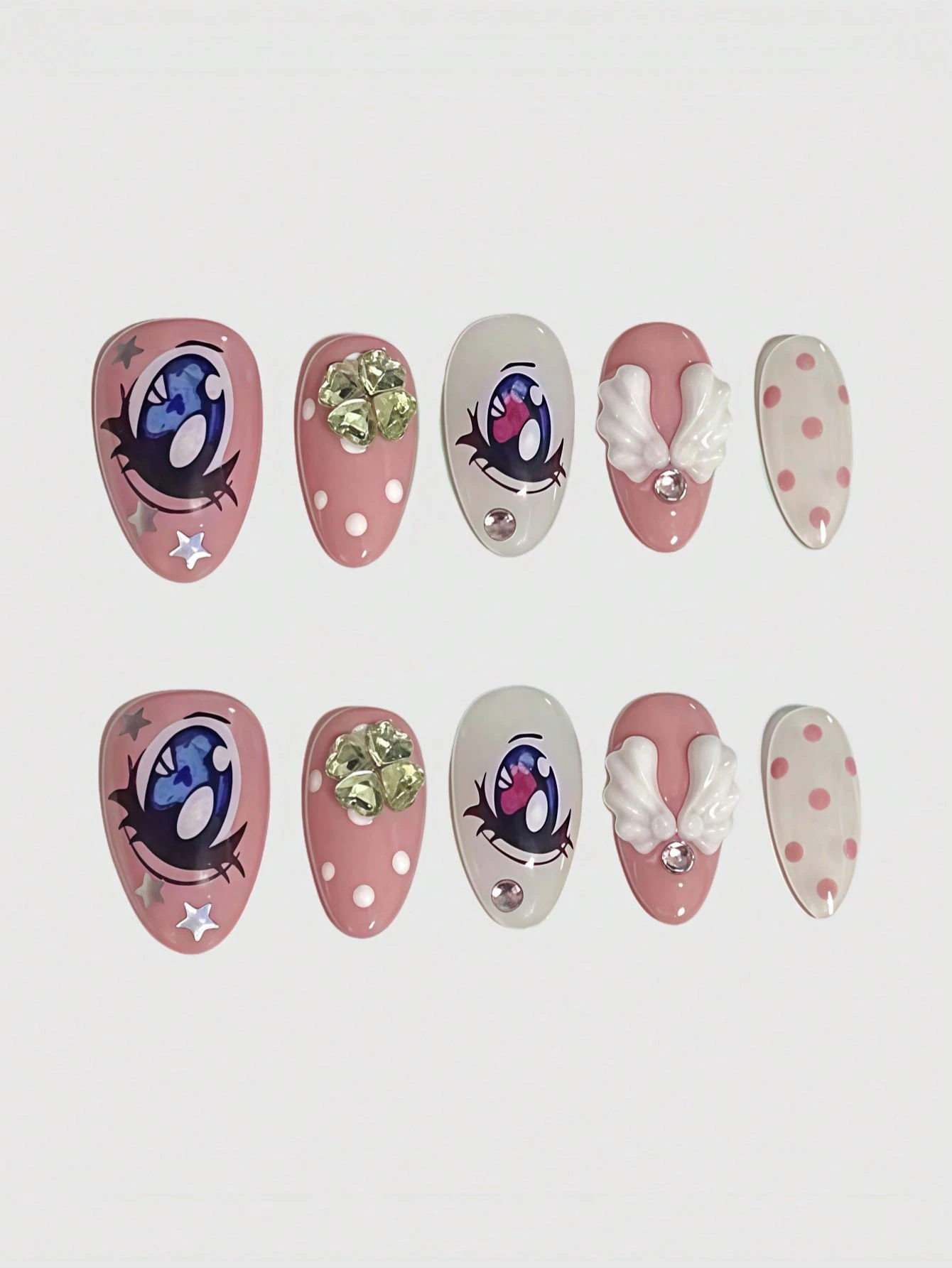 Anime 10pcs Kawaii Sweet Cute Eye Decor Angel Wings Y2K Lucky Clover Retro Polka Dot Harajuku Minimalist Mass Produced Handmade False Nails, Suitable For Anime, Campus, Dates, Shopping, Etc.