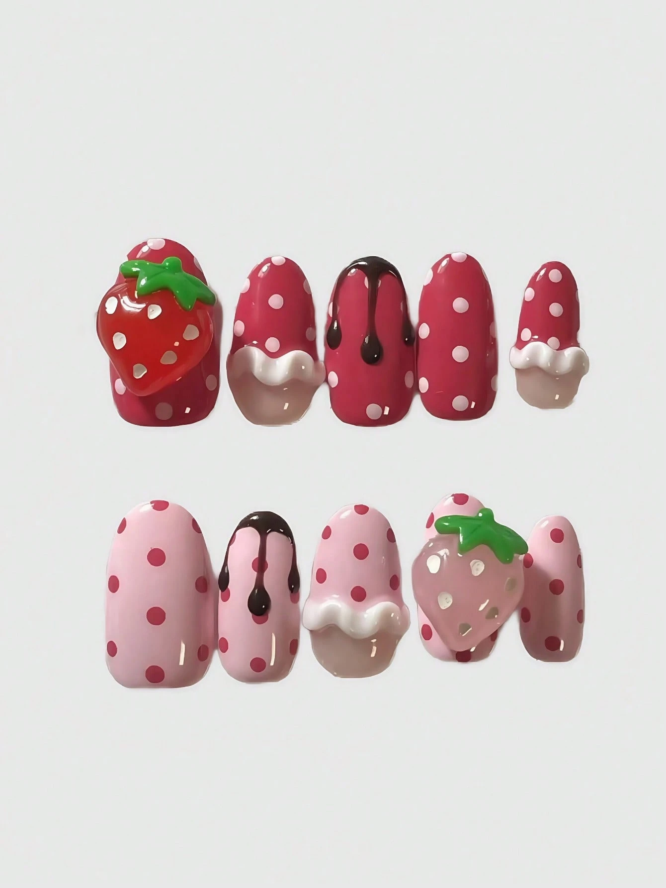 Anime 10pcs Kawaii Sweet Cute Strawberry Decor Vintage Polka Dot Pop Art Fashion Minimalist Lolita Mass-Produced Handmade False Nails For Women, Suitable For Shopping, School, Commuting, Dating, Suitable For Christmas, New Year