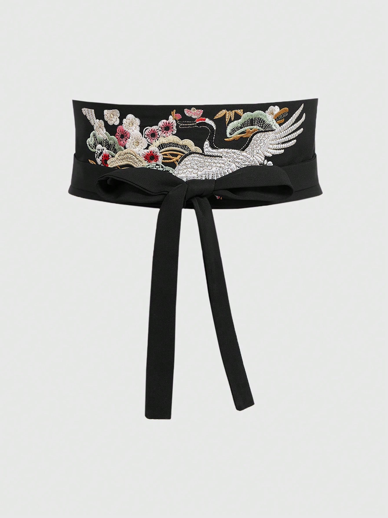 1Pc Black Retro Embroidered Crane Flower Pattern Tether Wide Belt Waist Corset, Simple And Versatile Women's Matching Single Item