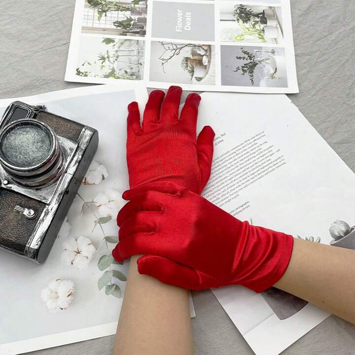 1pair Red Short Satin Gloves With Spandex For Dancing, Banquet, Evening Party, Performance, Reception