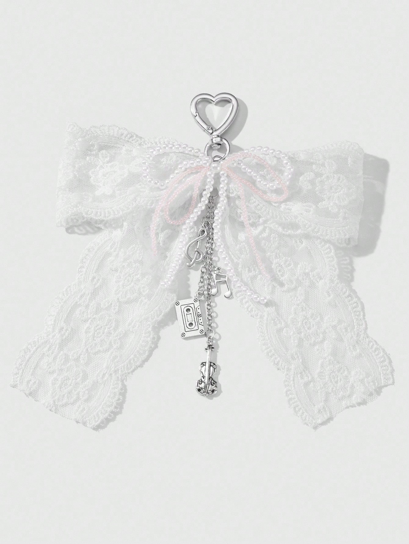 Kawaii 1pc Minimalist Handmade Beaded White Faux Pearl Lace Bow Guitar Music Note Tape DIY Keychain Bag Charm, Suitable For Women, Daily Wear Or Gift
