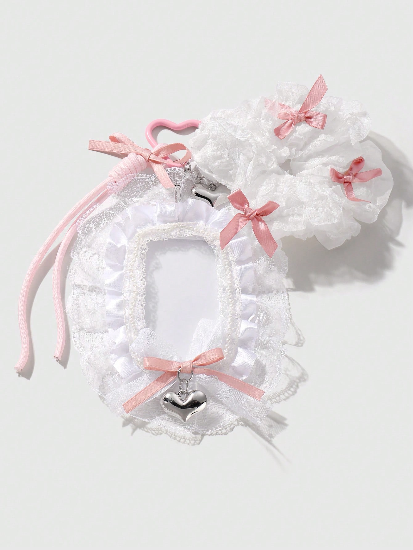 Kawaii 1pc Simple Korean Style High-Quality Versatile White Lace Bow, Heart-Shaped, Faux Pearl Edged Card Holder, Key Chain, Bag Pendant, Suitable For Office Worker, Students, Daily Wear, Holiday Gift