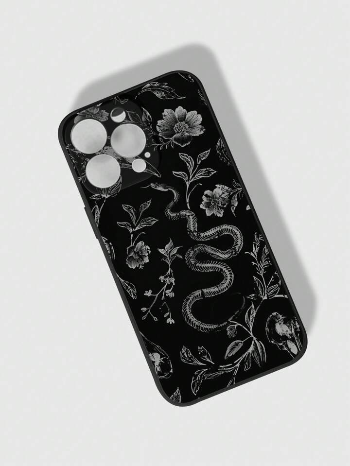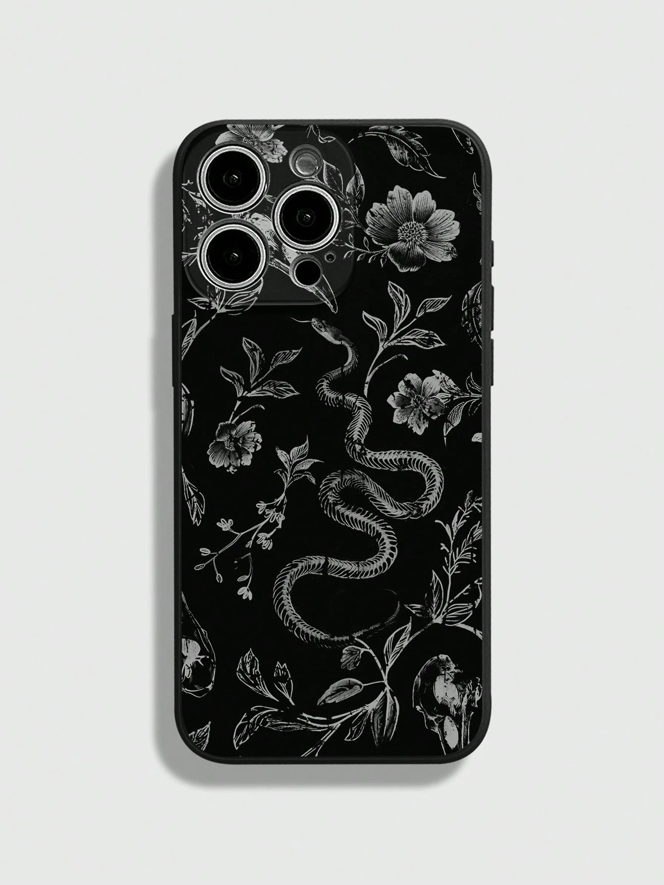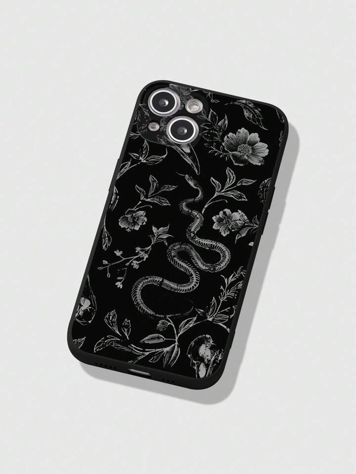 1pc Snake Pattern Print TPU Frosted Anti-Fall Black Phone Case Compatible With IPhone, Gothic Floral + Snake Bone + Skull Design