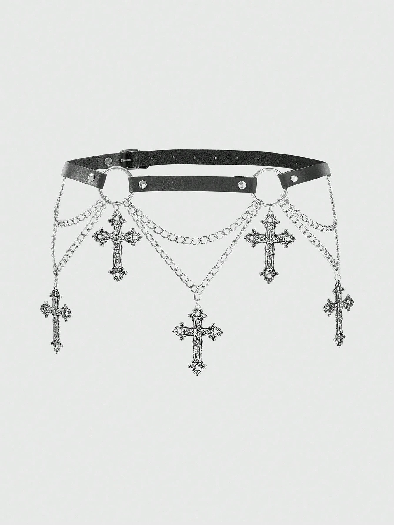 Goth 1pc Women's Black Circular Floral Vine Cross Decor Double Layer Chain Belt, Punk Style Decoration For Dress, Jeans, Halloween Accessory