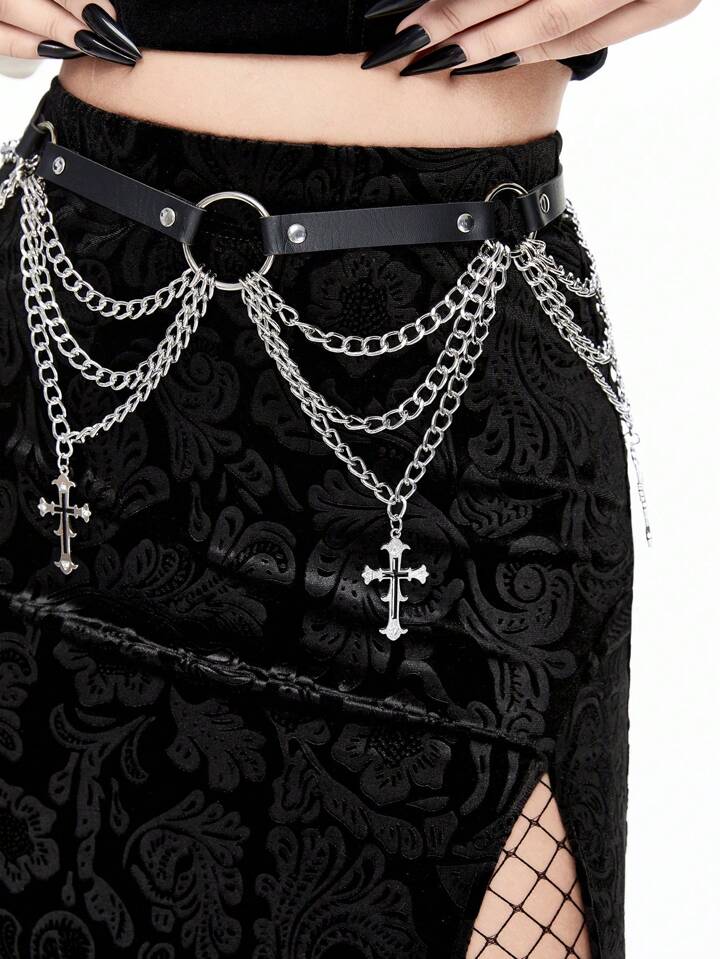 1pc Women's Black Triple-Layer Cross Chain Decoration Gothic Style Chain Belt Dress Accessory, Versatile Everyday Wear