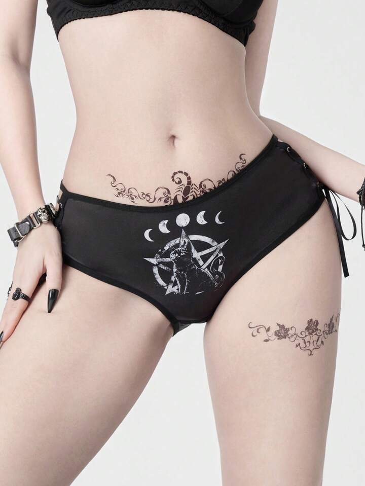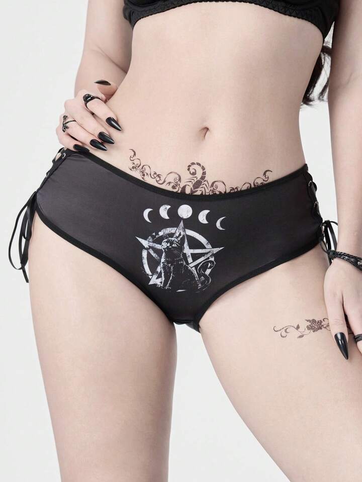 1pc Women's Gothic Black Cat Moon & Pentagram Lace-Up Thong Panty, Sexy Underwear