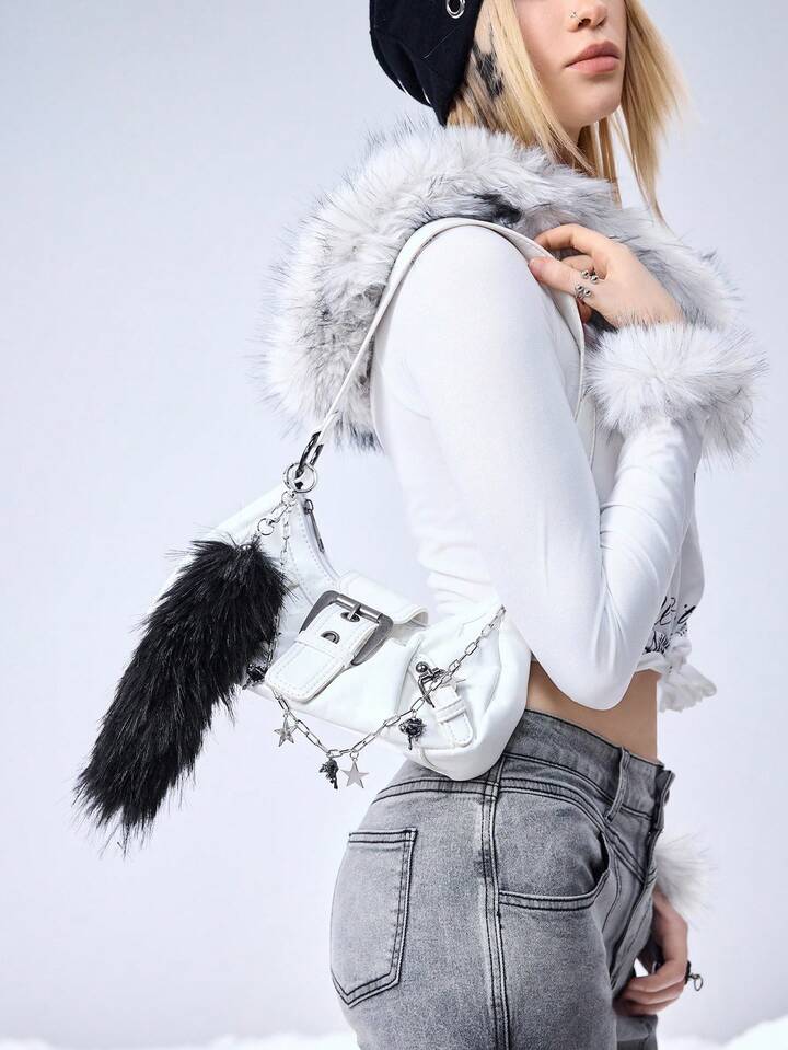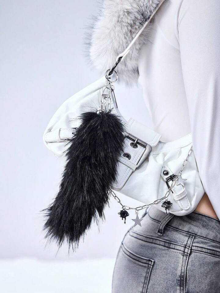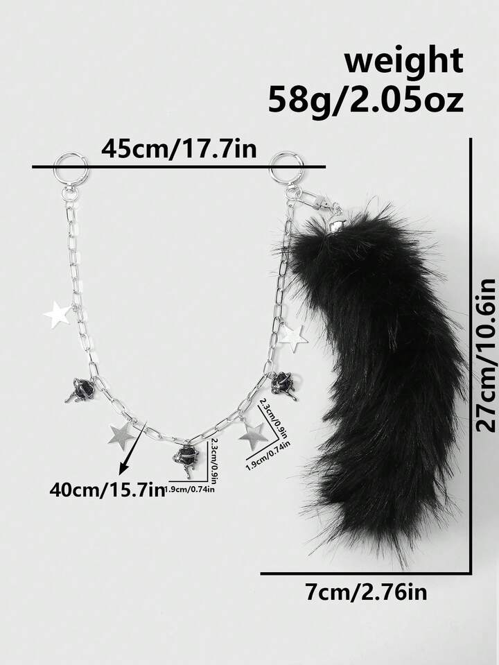 1pc Y2K Punk Goth Aesthetic Silver Hollow Chain Star Liquid Crystal Rhinestone Heart Pendant, Fluffy Faux Fur Wolf/Fox Tail Clip On For Women, Suitable For Daily Wear, Holiday Gift