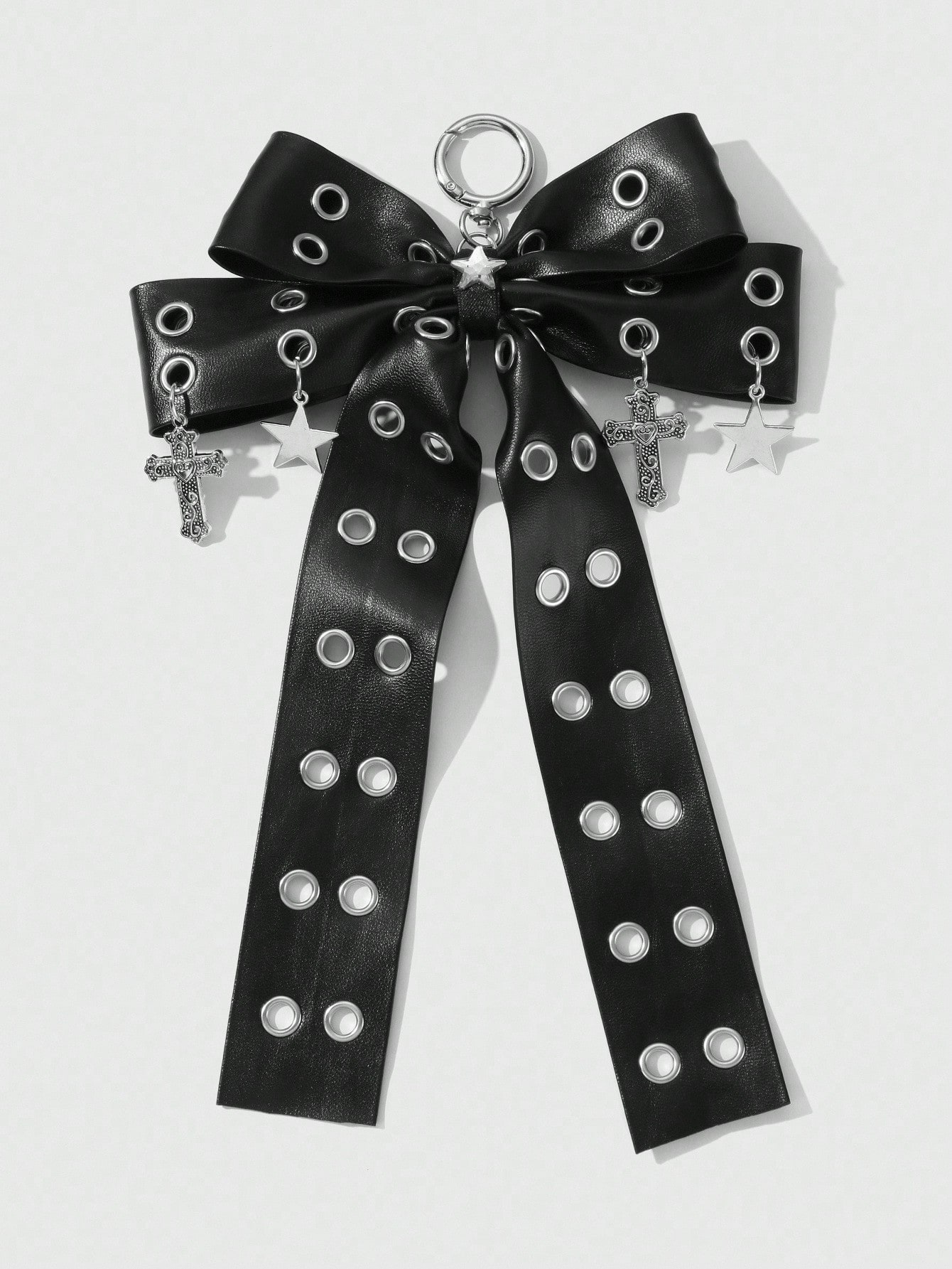 Grunge Punk 1pc Y2K Retro Punk Chic High-End Dark Gothic Style Black Leather Double-Layer Hollow Bowknot Star Cross Pendant DIY Keychain Bag Charm, Suitable For Women, Daily Wear Or Gift
