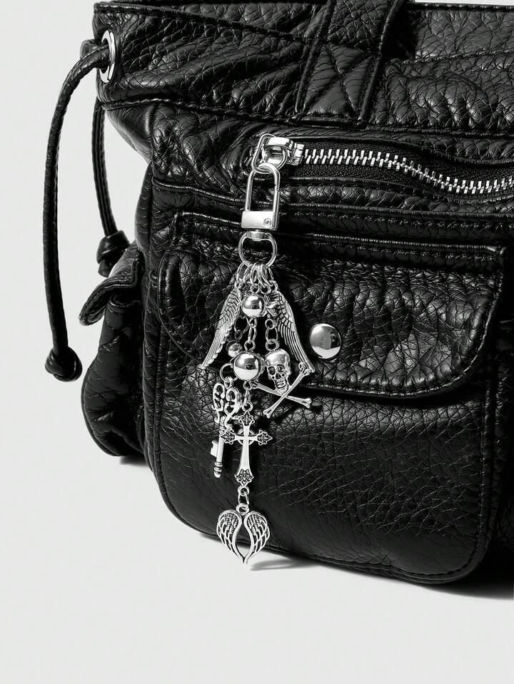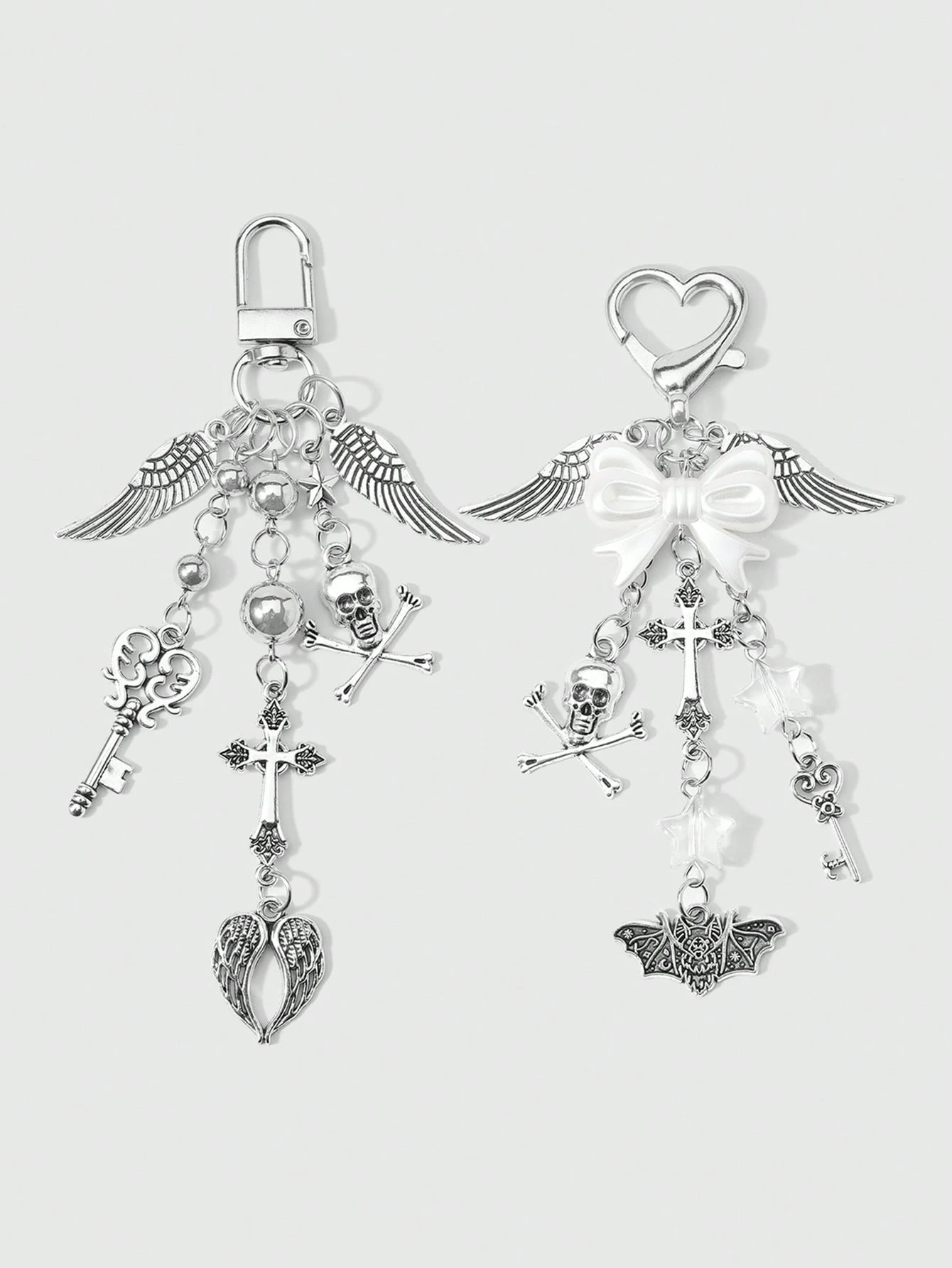 2 New Y2k Personalized Retro Fashion Sweet Cool Dark Style Gothic Silver Wings Faux PearlBow Star Bone Skull Pattern Key Cross Bat Wings Love Keychain Bag Pendant, Combination Set, Suitable For Couples, Sisters And Girlfriends Daily Wear, Holiday Gifts