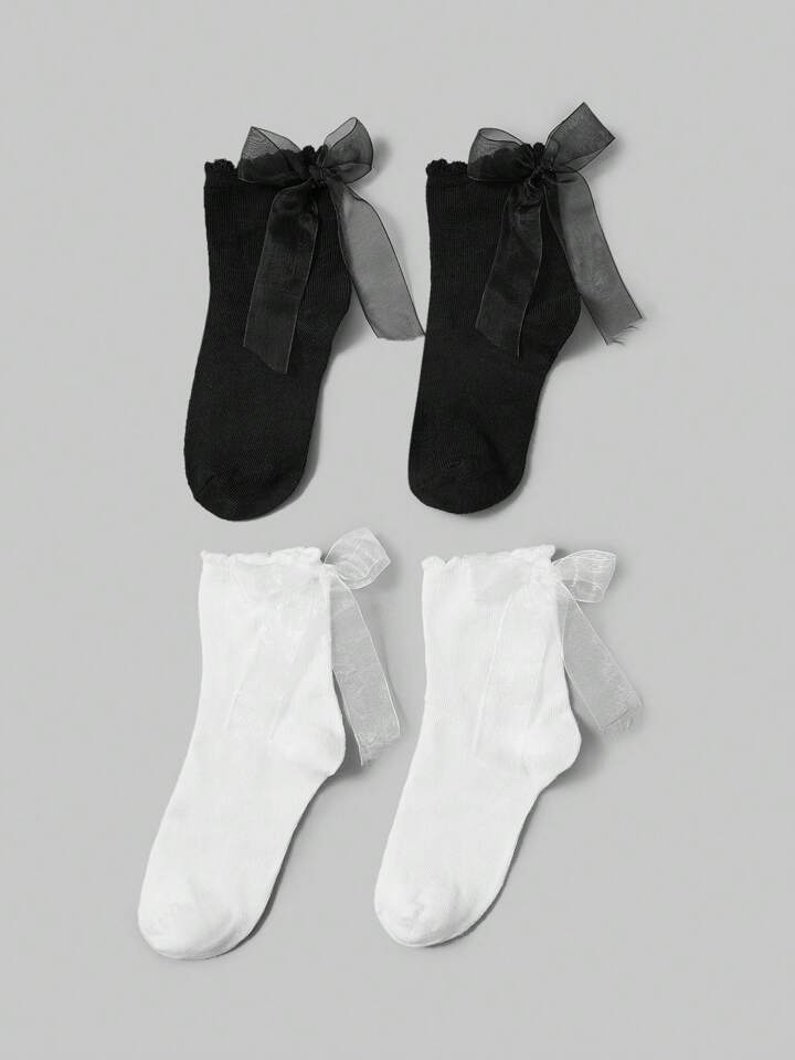 Kawaii 2 Pairs Bow Decor Mid-Calf Socks, Cute Lace Trim Solid Color Socks, JK Style For Women