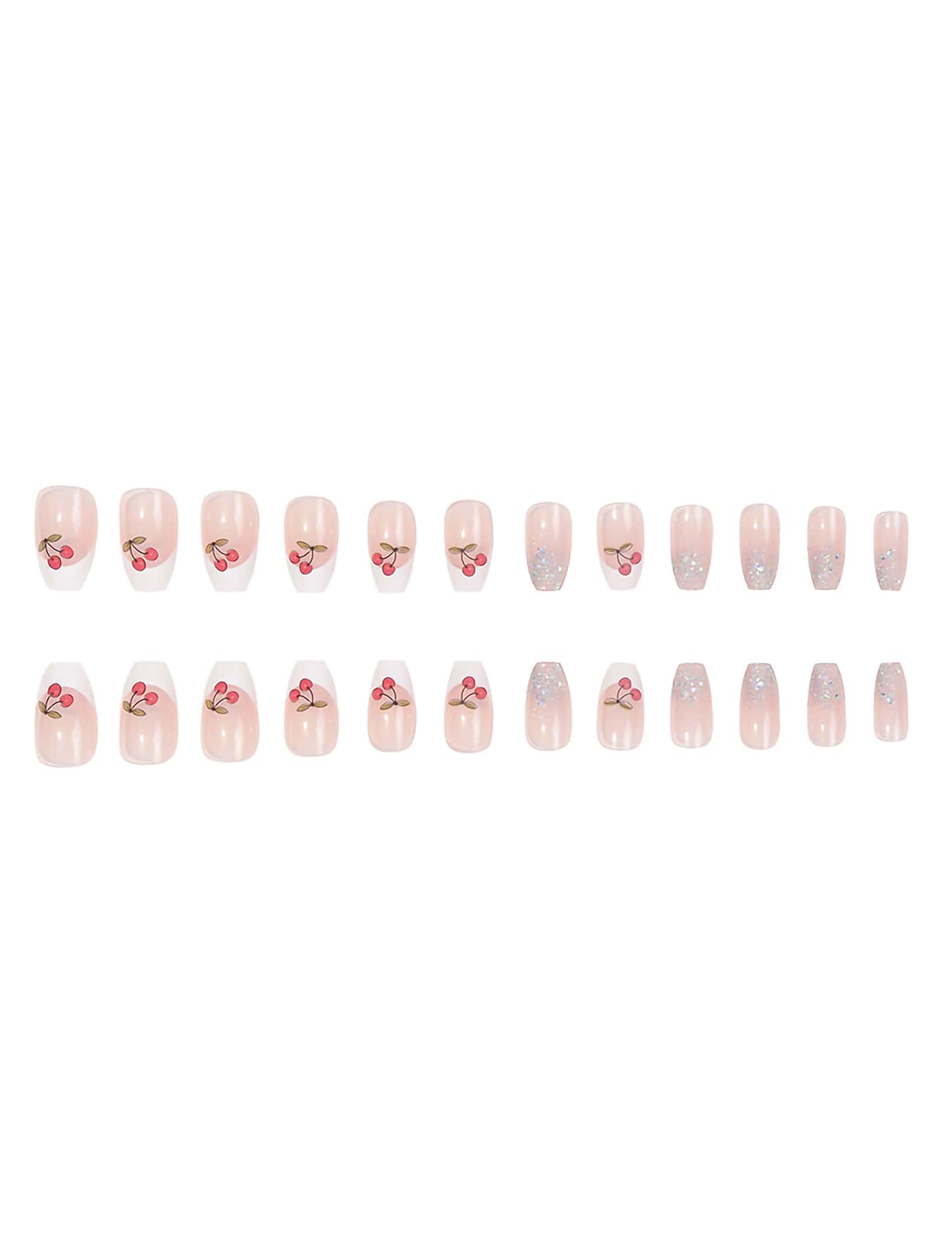 24pcs Coffin Cherry Print Fake Nail & 1sheet Tape