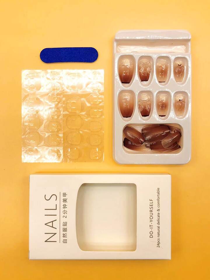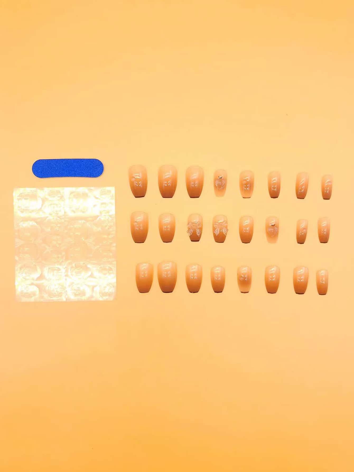 24pcs Long Coffin Bow Decor Fake Nail & 1pc Nail File & 1sheet Tape