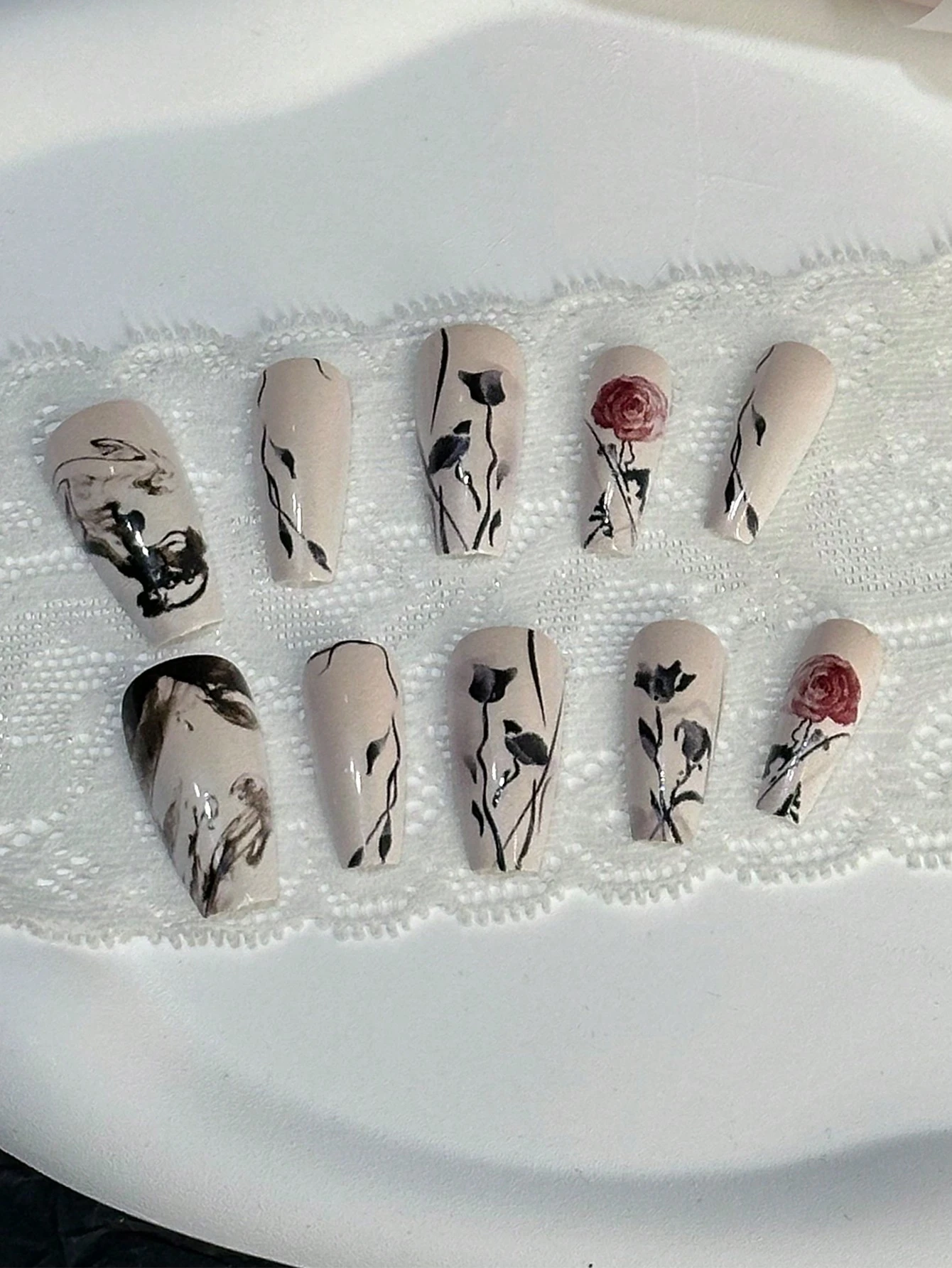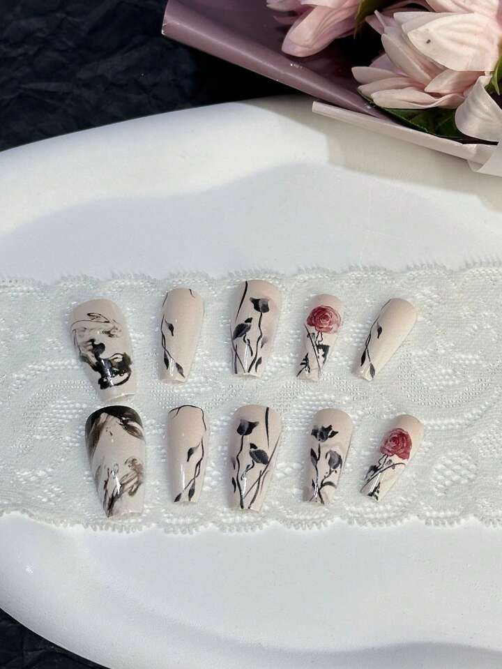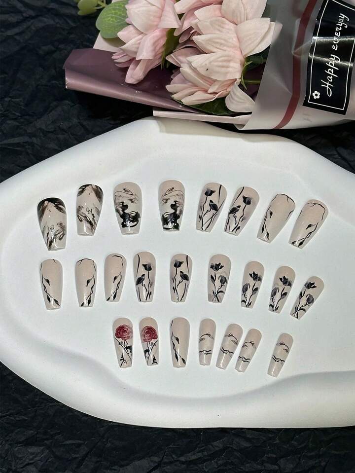 24pcs Long Coffin Flower Pattern Fake Nail