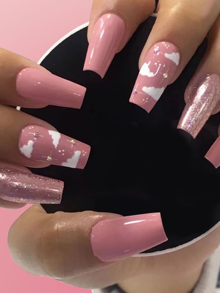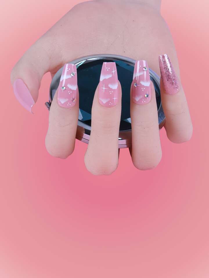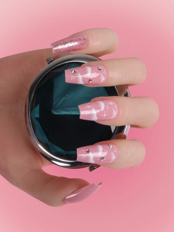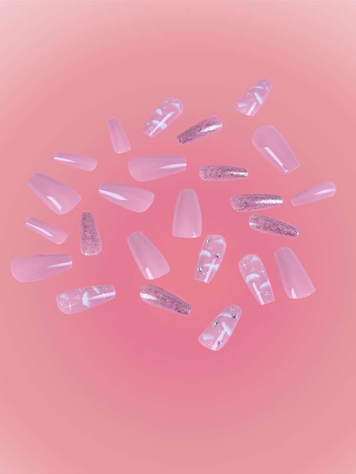 24pcs Long Coffin Rhinestone Decor Fake Nail & 1sheet Tape