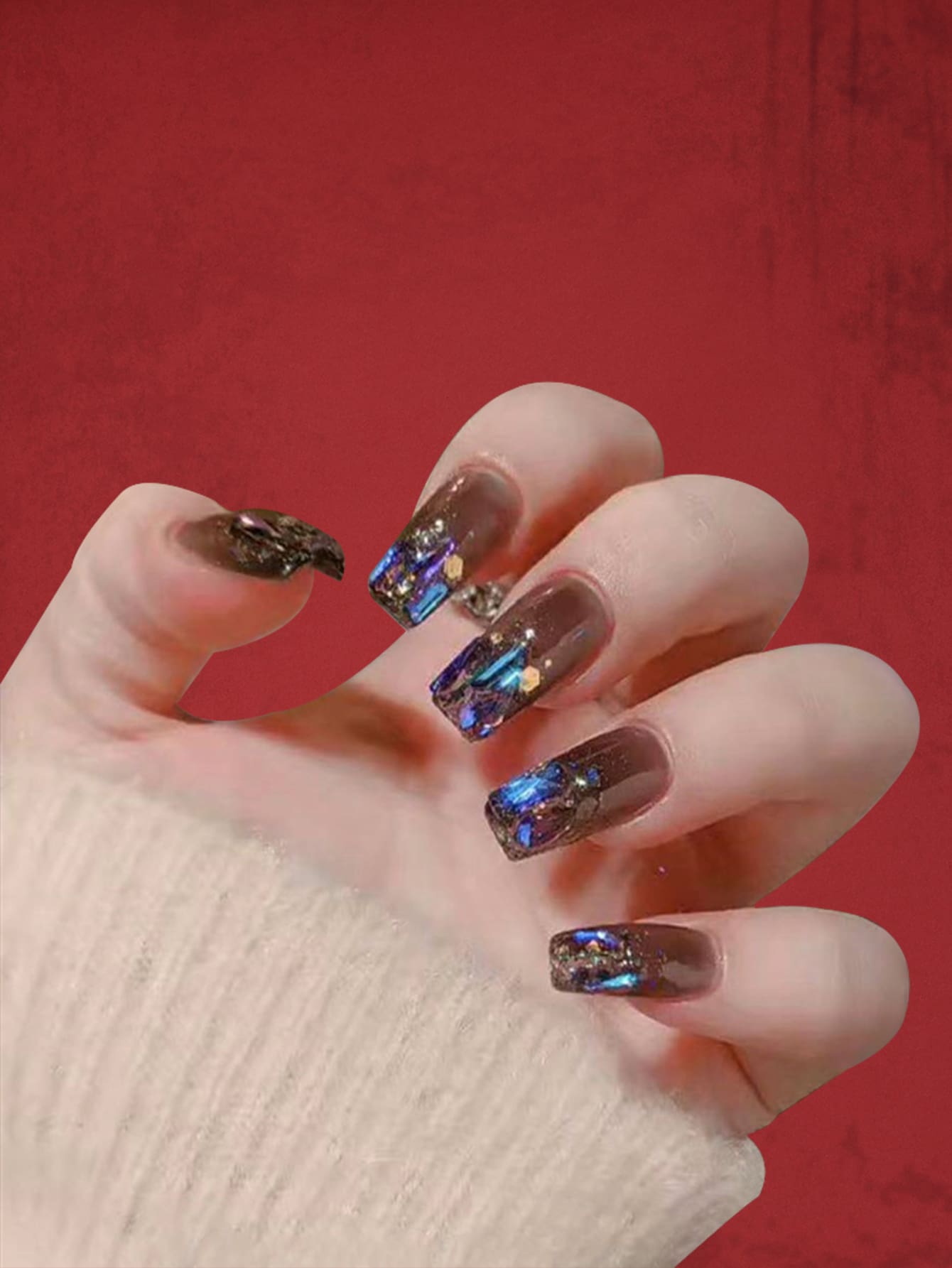 24pcs Long Square Rhinestone Decor Fake Nail & 1sheet Tape