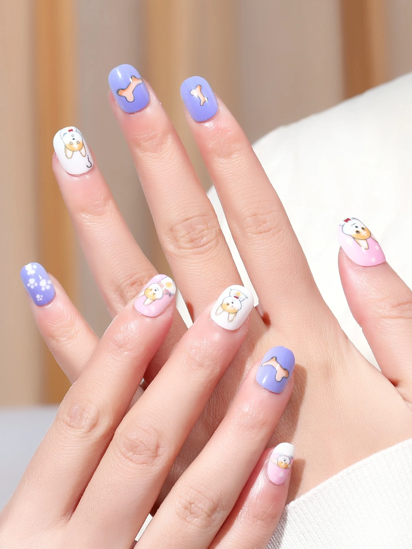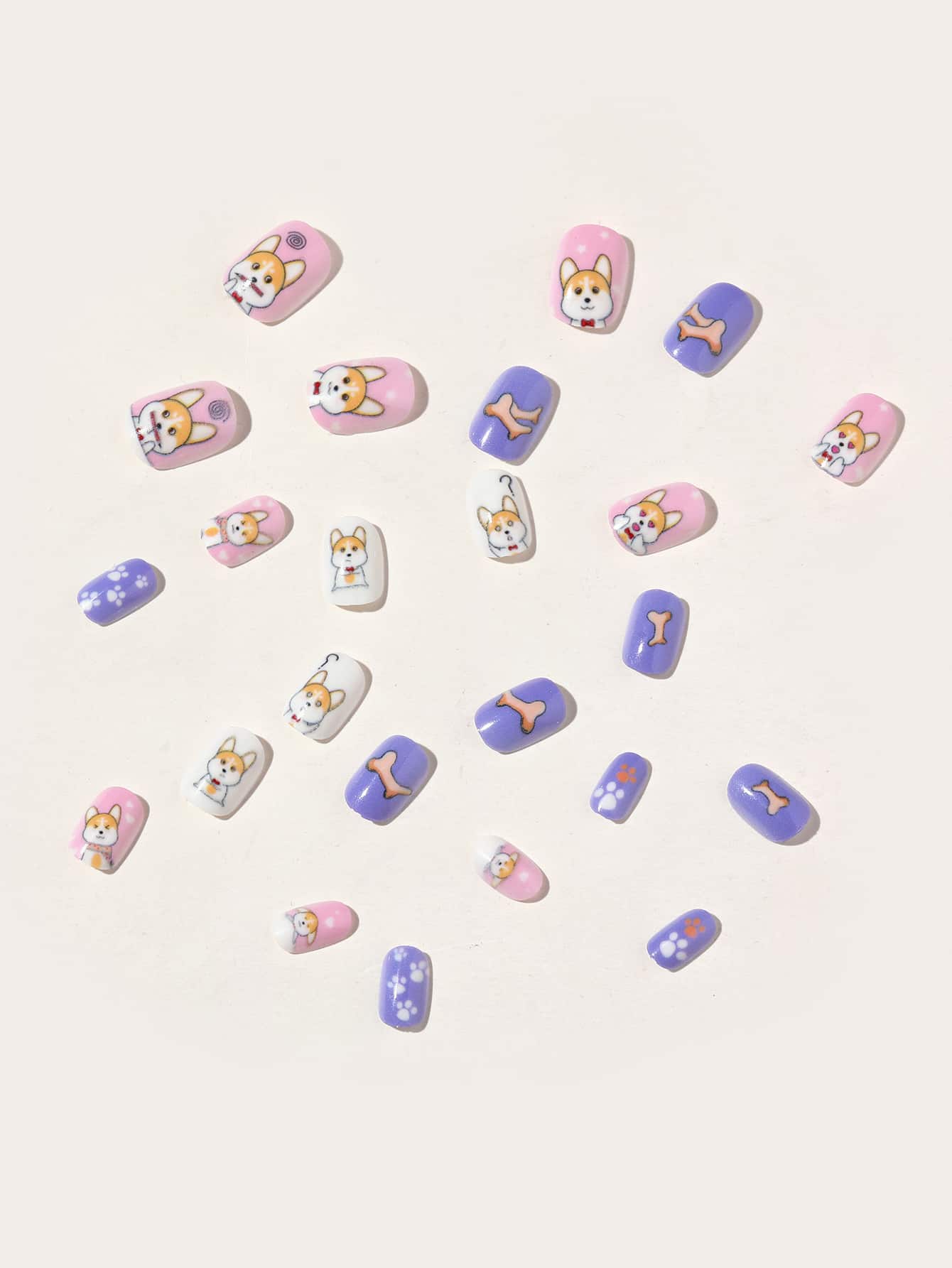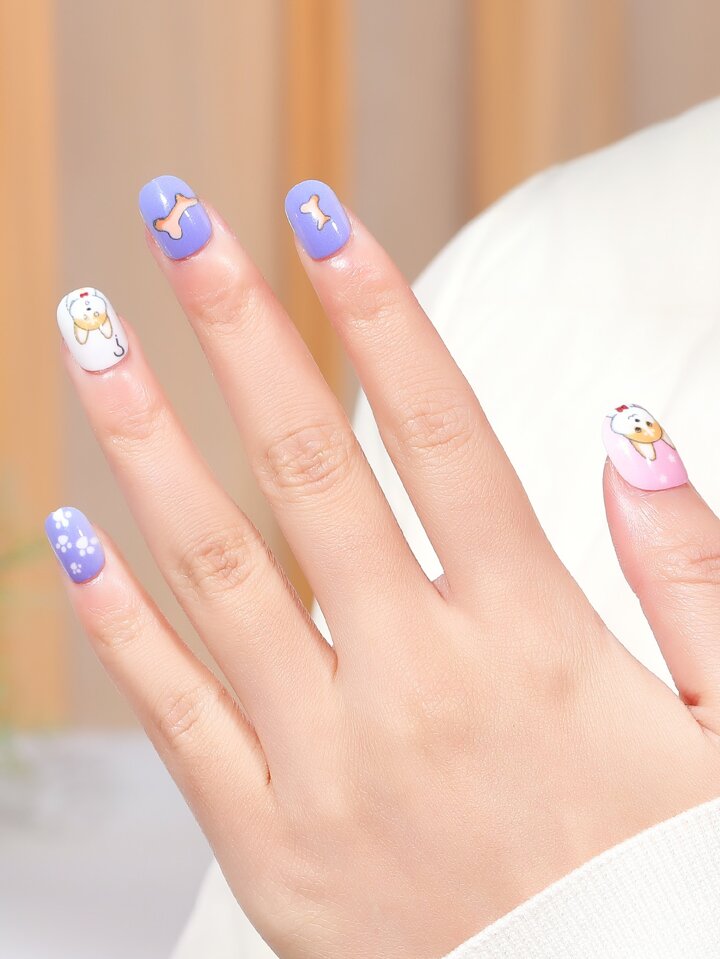24pcs Short Oval Cartoon Dog Pattern Fake Nail & 1sheet Tape & 1pc Nail File