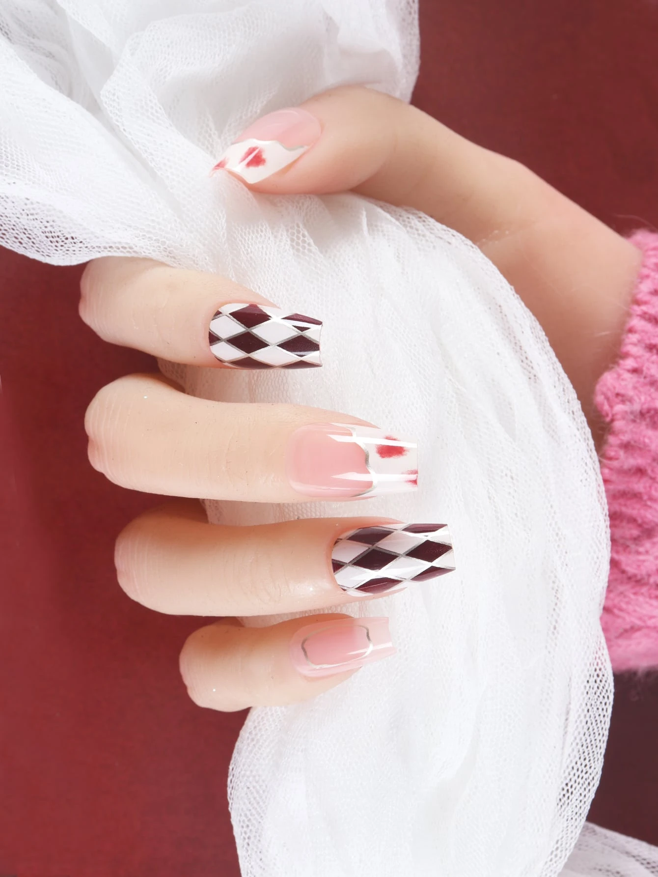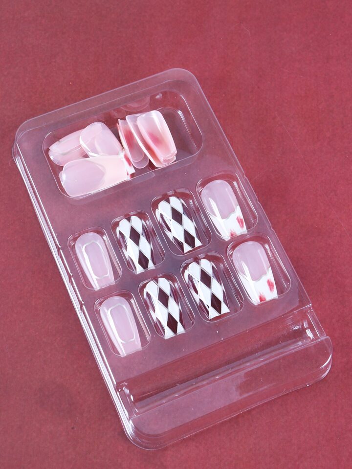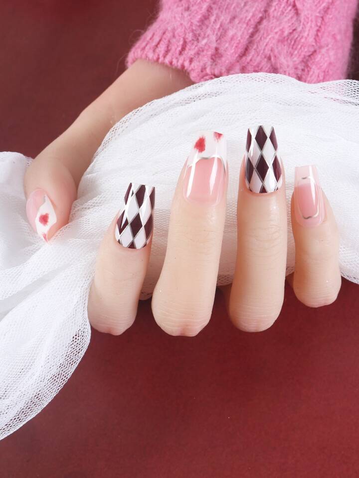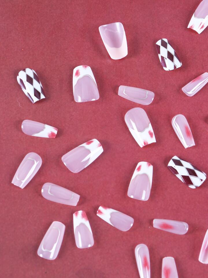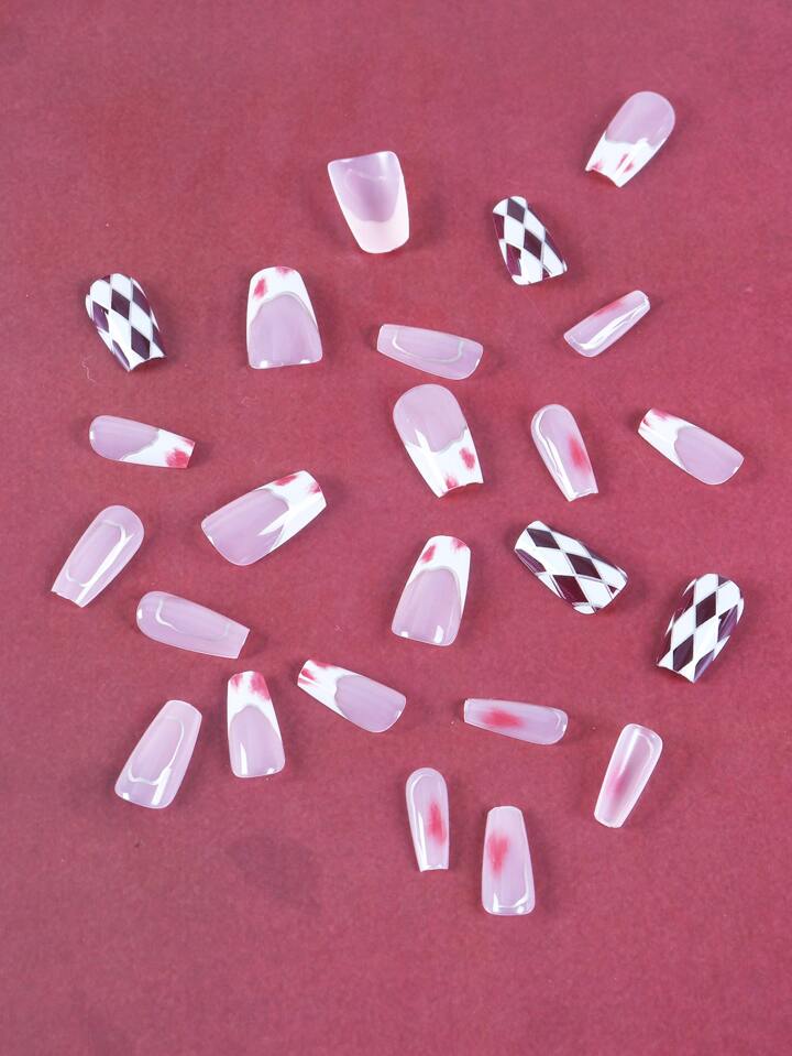 24pcs Short Square Plaid Fake Nail & 1sheet Tape
