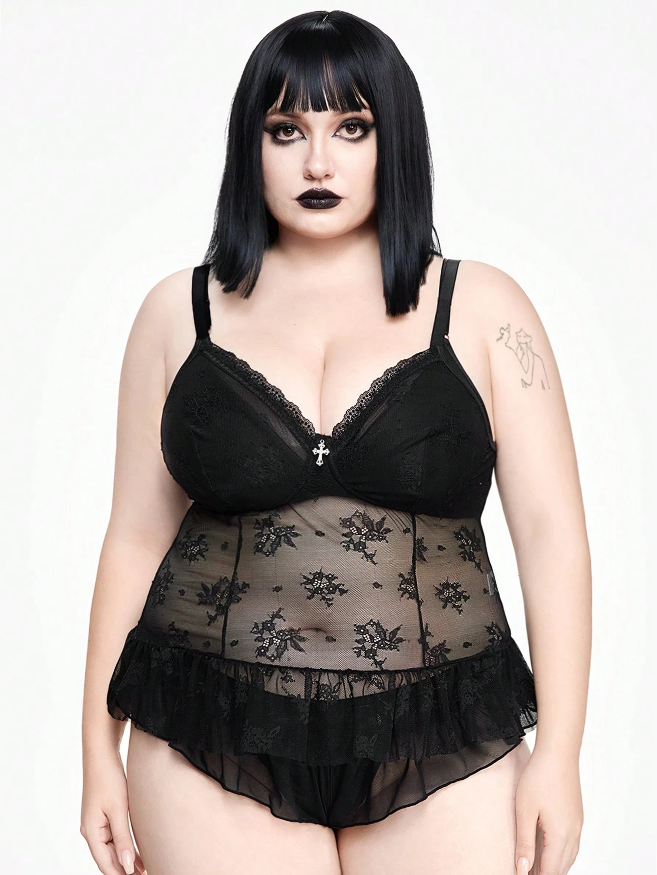 2pcs Dark Gothic Contrast Lace Cross Plus Size Sexy Lingerie Set