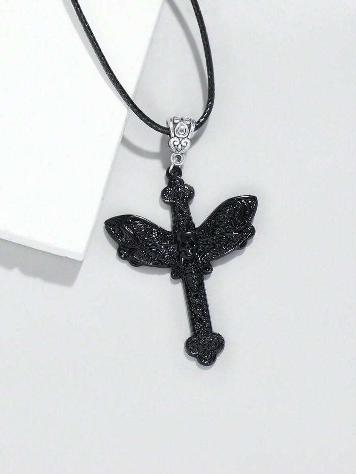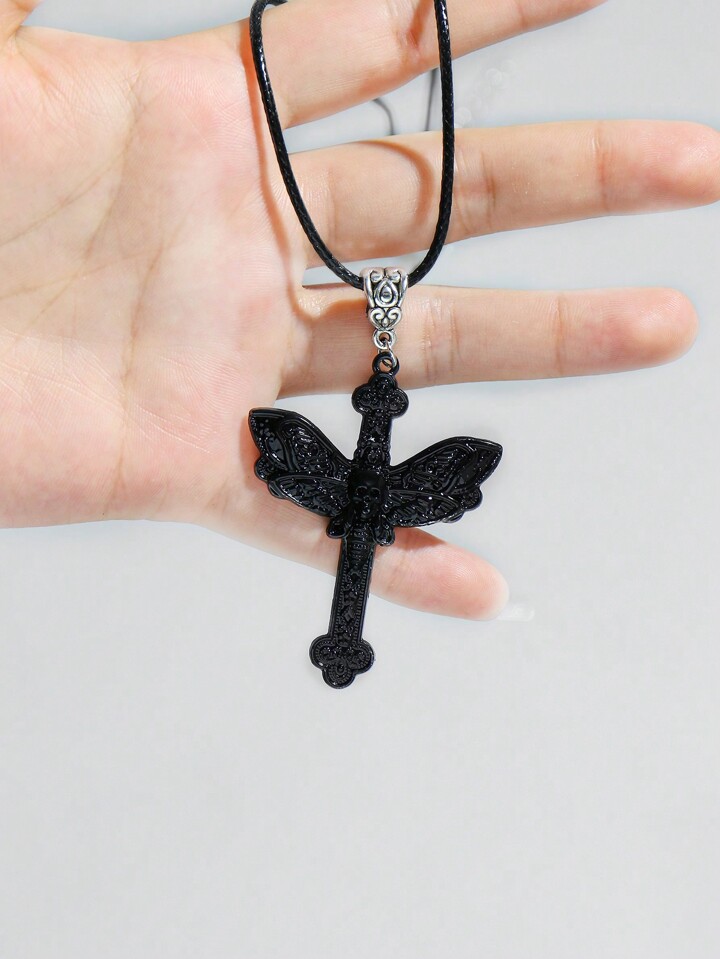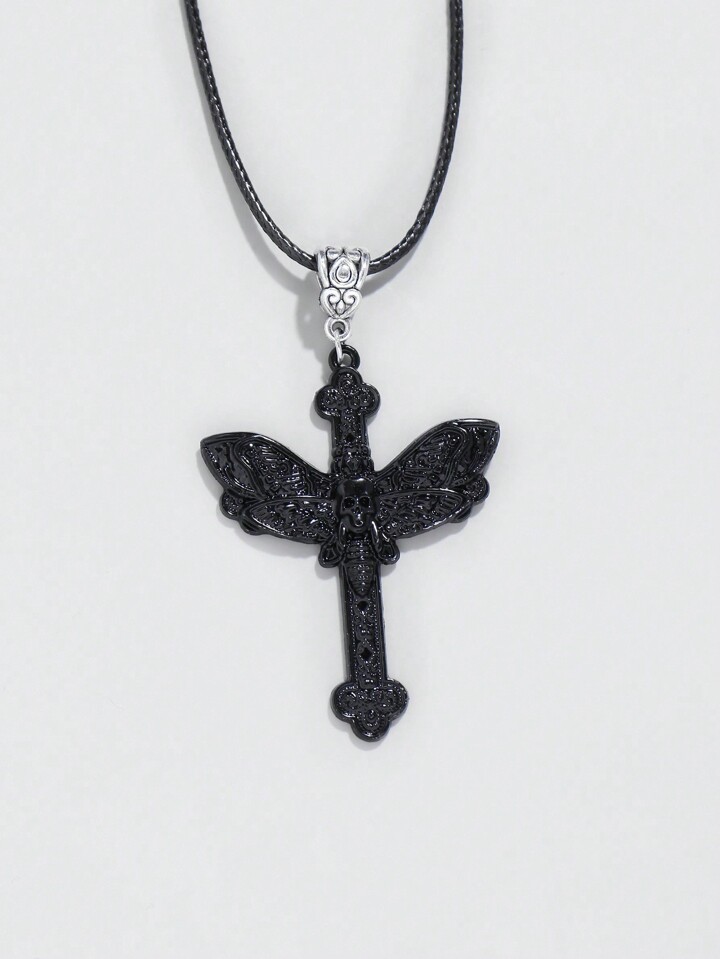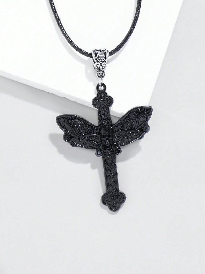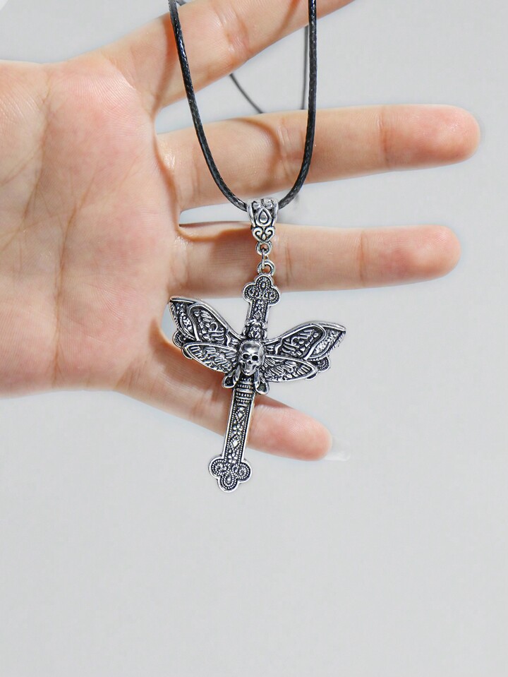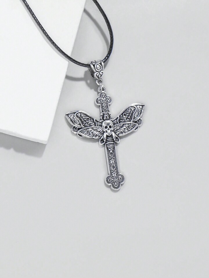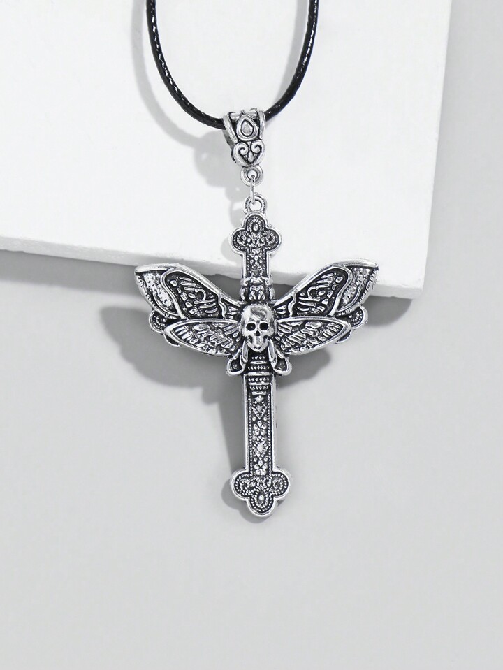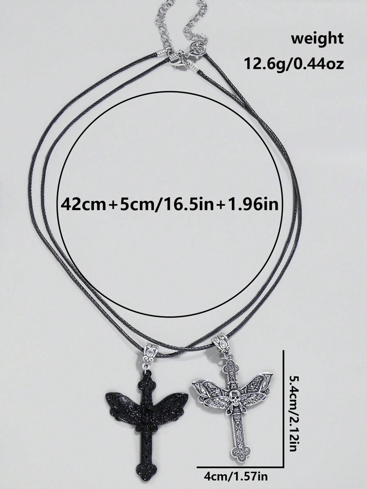 2pcs Gothic Dark Style Black & Silver Skull, Demon, Moth Pendant Necklace Set For Women