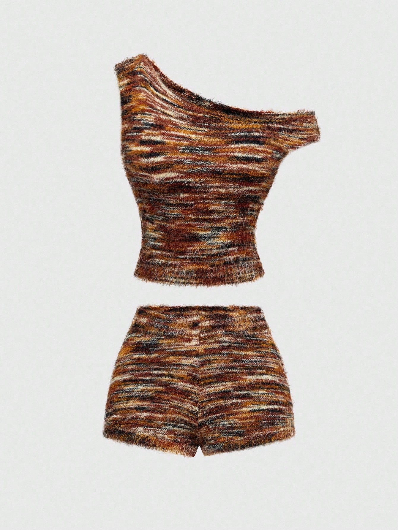 Fairycore 2pcs Vintage Mixed Color Knit Set - Off Shoulder Crop Top + High Waist Shorts, Sexy Chic Vacation Outfit