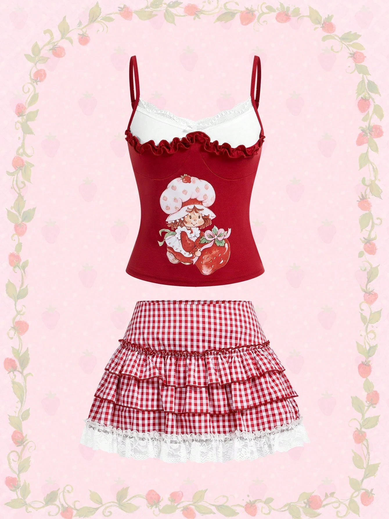 2pcs Women's Vintage Cute Contrast Lace Frill Trim Cami Top & Plaid Mini Skirt Set