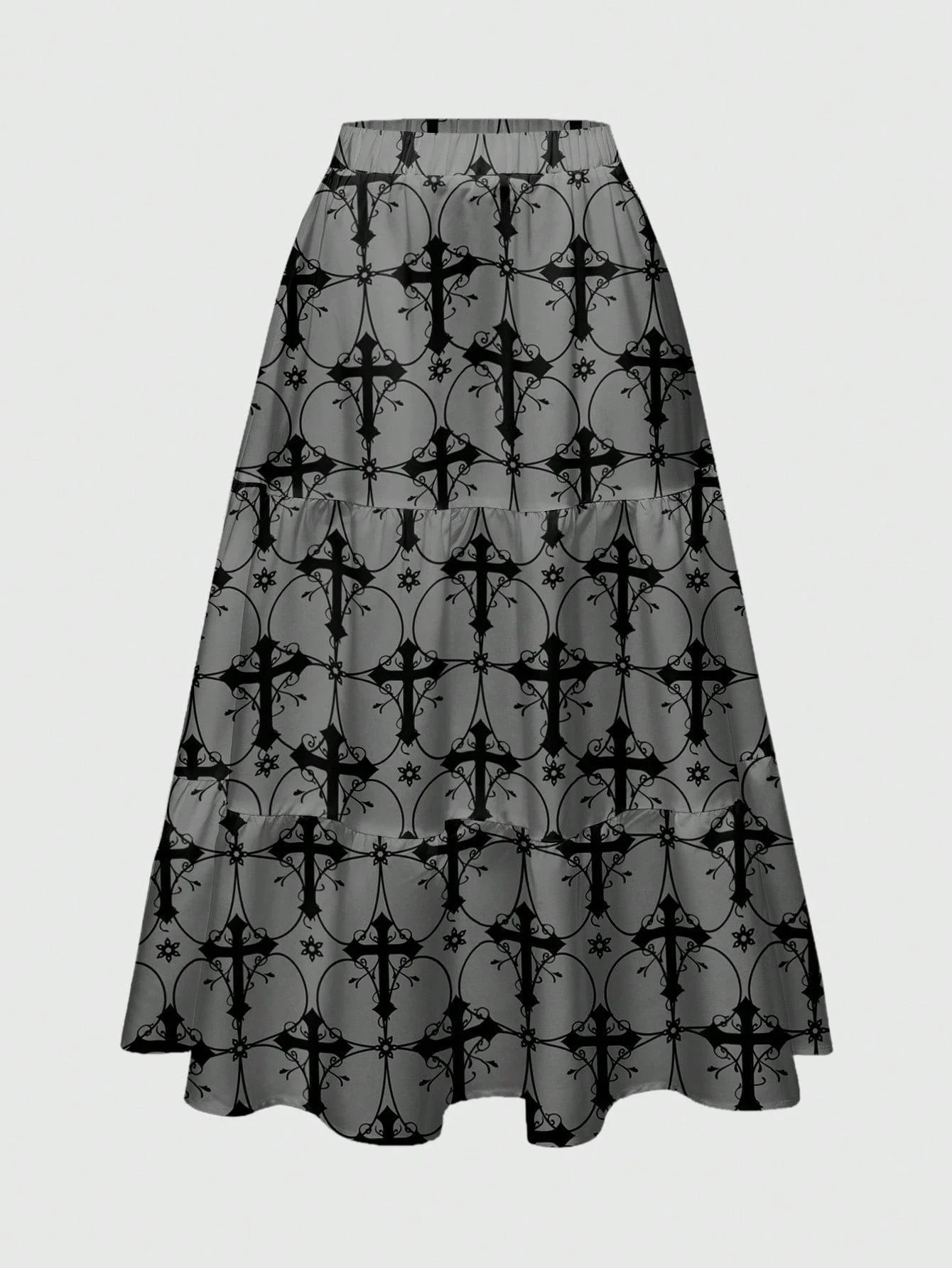 3-Layer Gothic Cross & Vine Print Black & Grey Pleated Skirt For Women