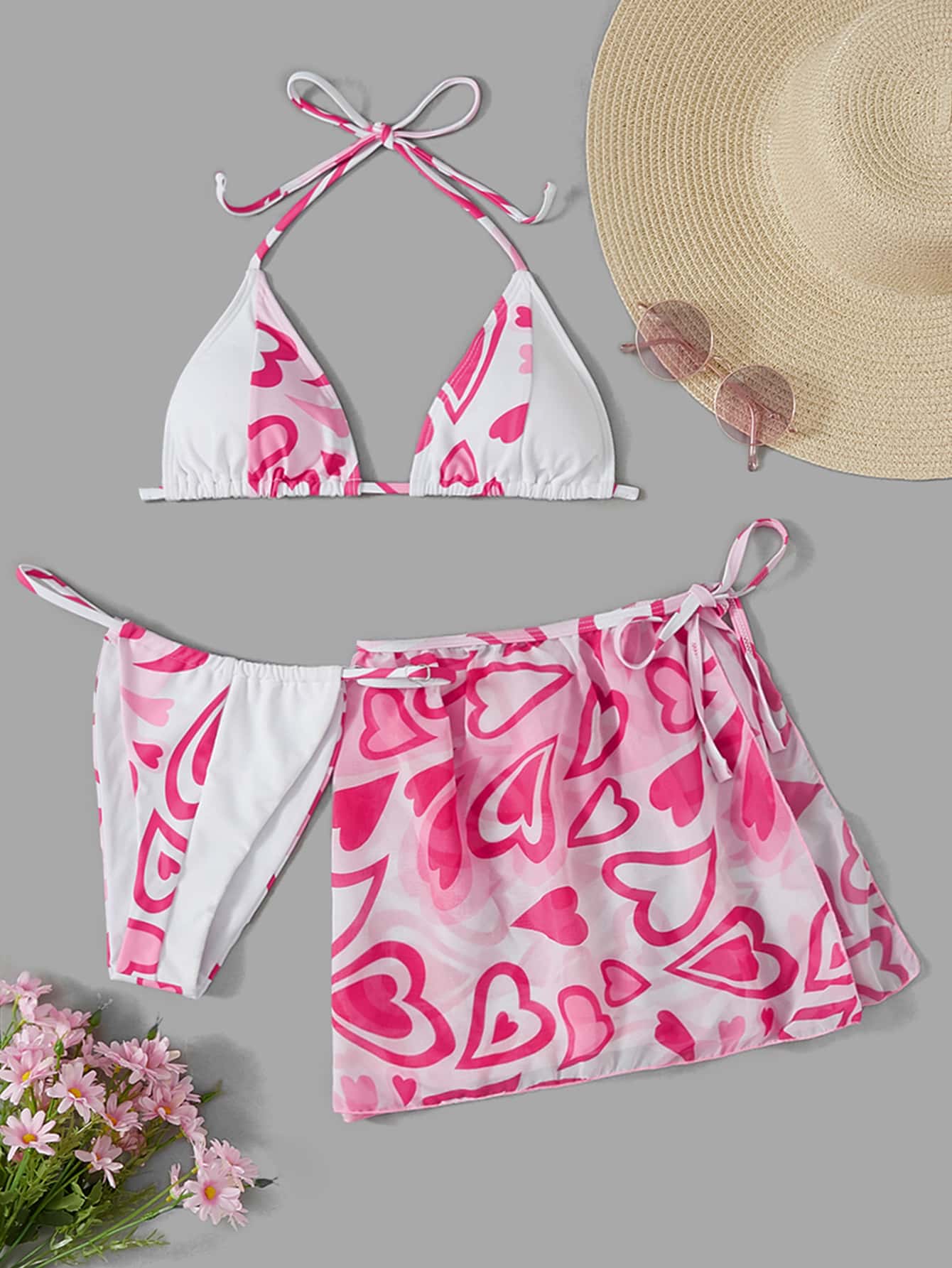 3packs Heart Graphic Triangle Halter Bikini & Beach Skirt