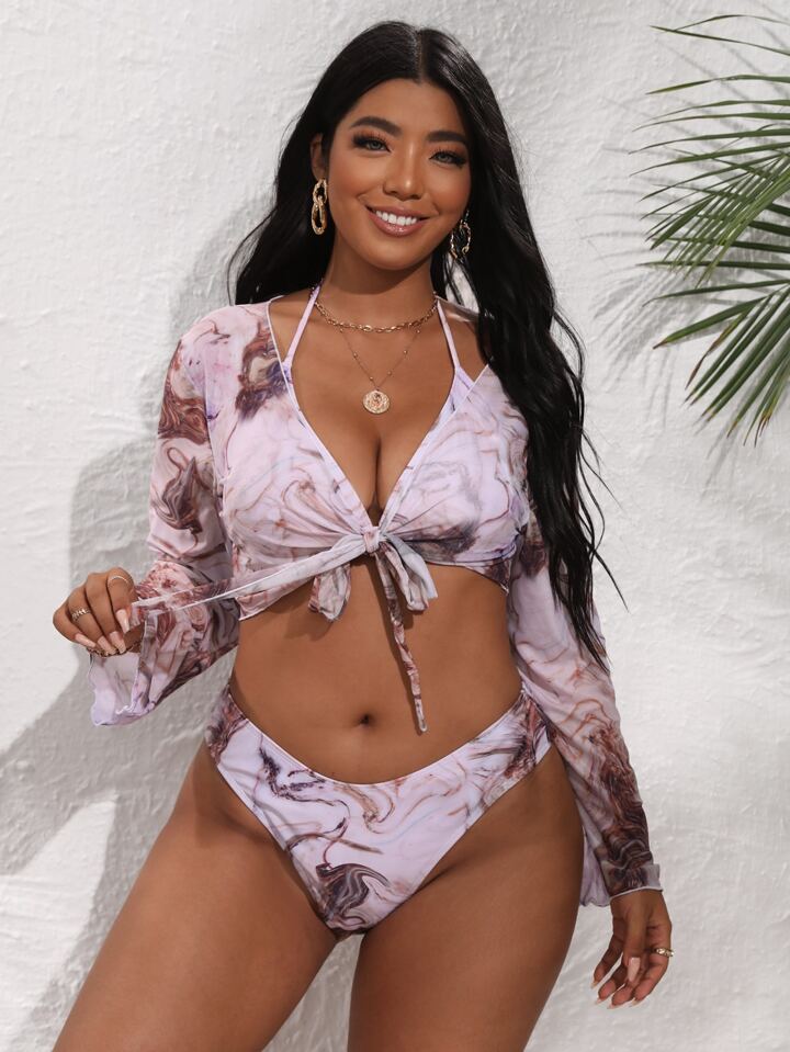 3packs Plus Size Triangle Bikini & Kimono Summer Beach
